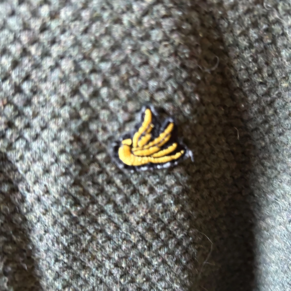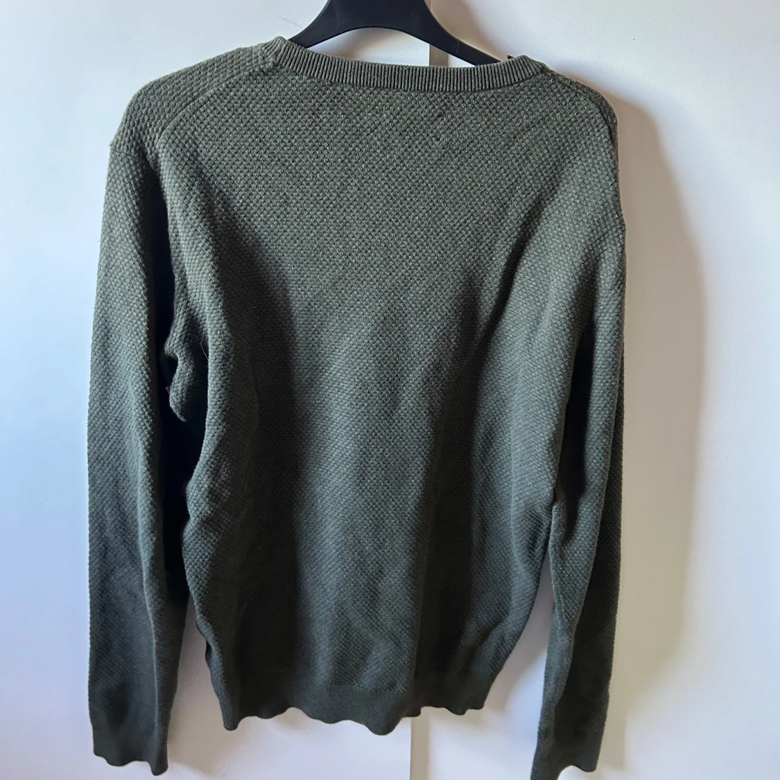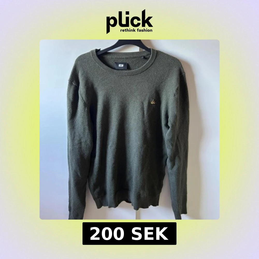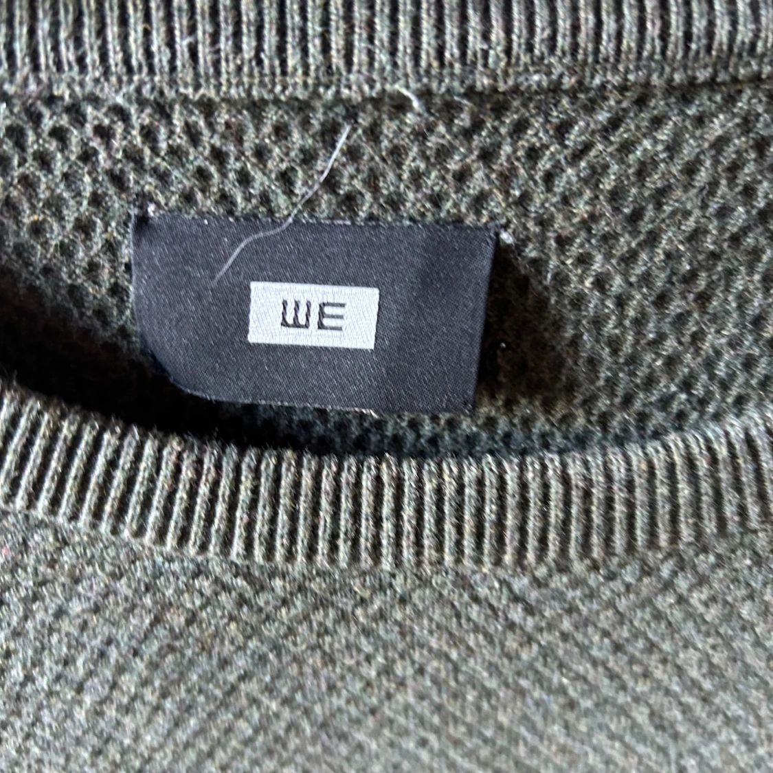 Säljer en olivgrön stickad tröja från WE med rund hals och lång ärm. Tröjan har en diskret gul broderad detalj på bröstet och en grovstickad struktur som ger en cool känsla. Perfekt för lager-på-lager under hösten och vintern.