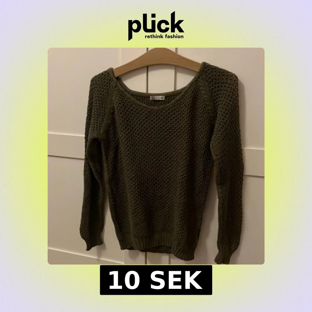 Säljer en olivgrön stickad tröja. Tröjan har långa ärmar och en rund halsringning. Sliten och kanske lite missfärgad på sidan