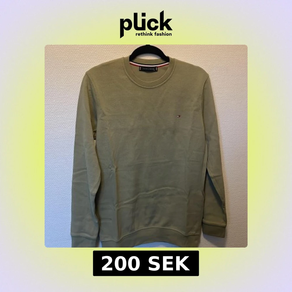 Snygg olivgrön sweatshirt från Tommy Hilfiger i storlek S. Tröjan har rund hals, långärmade ärmar och ett litet broderat Hilfiger-logo på bröstet. Tillverkad i mjuk bomull med ribbade muddar vid ärmslut och nederkant. Perfekt för chill och streetwear.