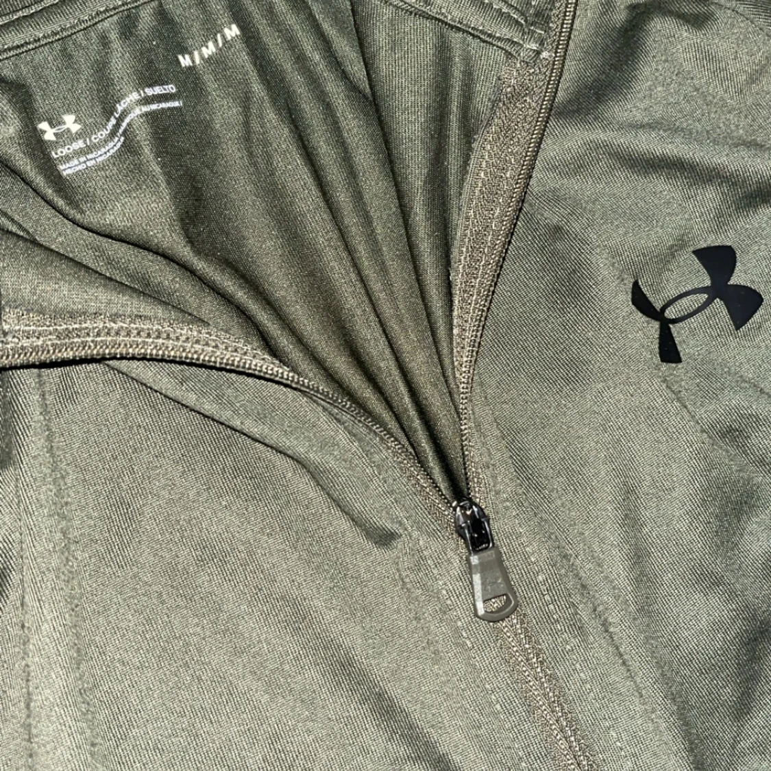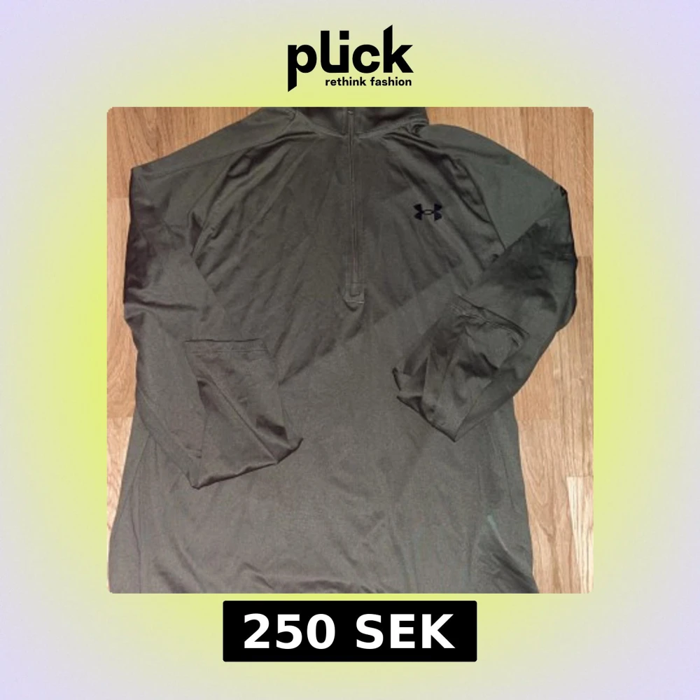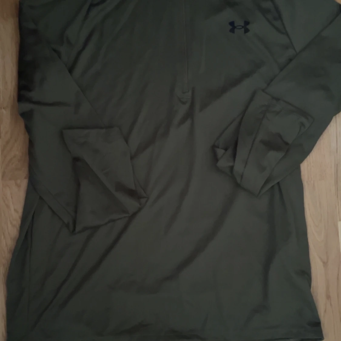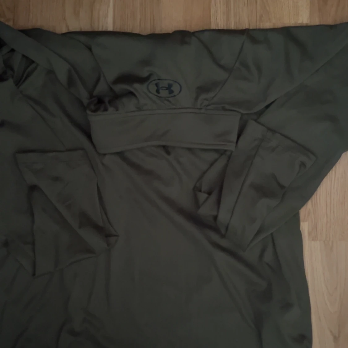 Säljer en olivgrön långärmad träningströja från Under Armour med halv dragkedja framtill. Perfekt för träning eller utomhusaktiviteter. Tröjan har en sportig look och är tillverkad i ett syntetmaterial som andas.