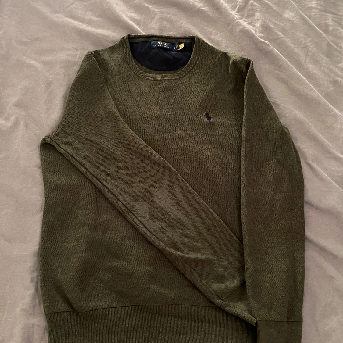 Säljer en stilren olivgrön tröja från Ralph Lauren med rund halsringning och broderad logotyp på bröstet. Perfekt för en avslappnad och snygg look.