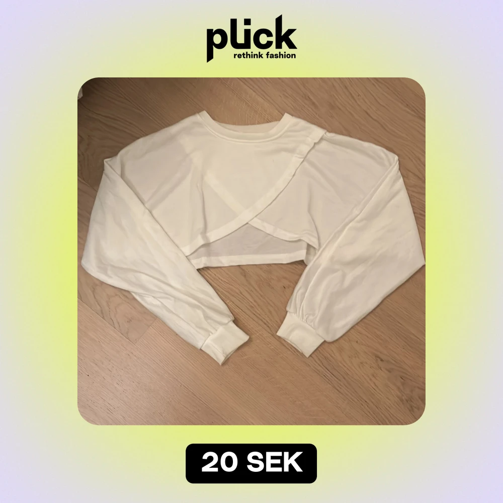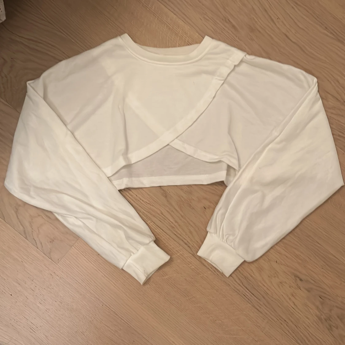 Säljer en superfin vit croppad tröja med en unik omlott-design framtill. Tröjan har långa ärmar med ribbade muddar som ger en skön passform. Perfekt för både vår och sommar! 🌼