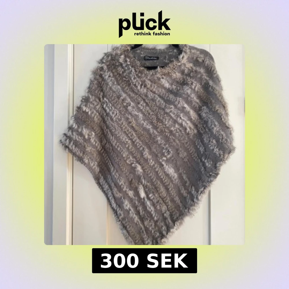 Säljer en fluffig och mysig grå poncho från Fashion, tillverkad av 90% kaninpäls och 10% akryl. Den har ett snyggt randigt mönster och är perfekt för att hålla sig varm under kyliga dagar. Ponchon har en unik form med korta ärmar och mjuk pälsstruktur.