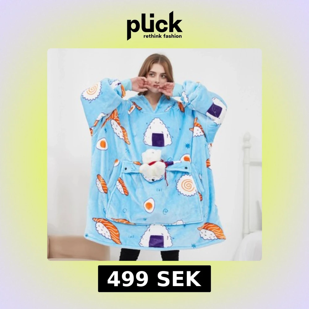 Supermysig och oversized hoodie i ljusblå fleece med gulligt sushi-mönster och stora fickor framtill. Tröjan har huva och långa ärmar, perfekt för att chilla hemma. Söt nalle medföljer som detalj på fickan. Unik och rolig design för dig som älskar japansk stil!