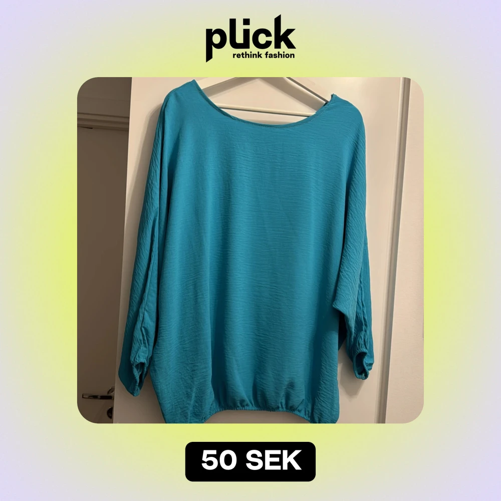 Säljer en turkos tröja med trekvartsärmar och lös passform. Tröjan har en rund halsringning och elastisk nederkant för en bekväm stil. Perfekt för en avslappnad look.