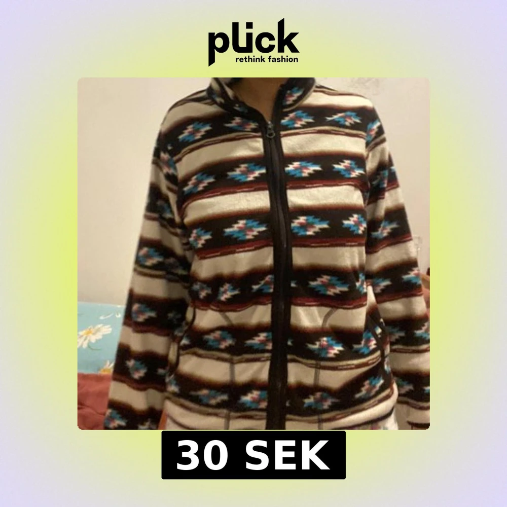 Fleecejacka med brunt, beige och blått mönster, hel dragkedja och hög krage. Jackan har ett coolt rutigt och etno-inspirerat mönster, två fickor framtill och är långärmad. Står strl 14 men tycker den är stor för mig som är XS 🤍