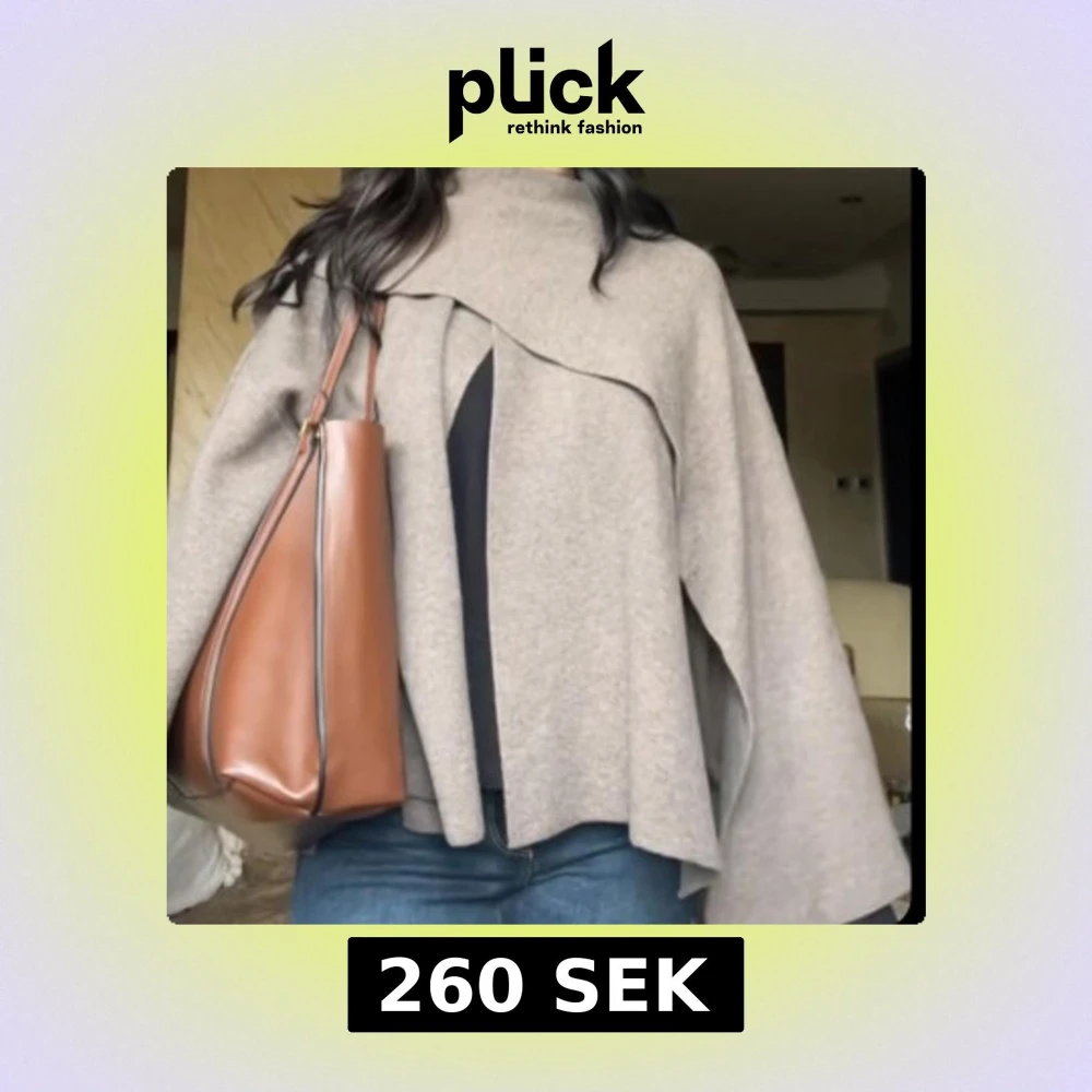 Säljer en beige oversized kofta med breda ärmar. Koftan har en stor dekorativ knapp vid halsen och är tillverkad i mjukt stickat material. Perfekt för lager-på-lager och chill höststil.
