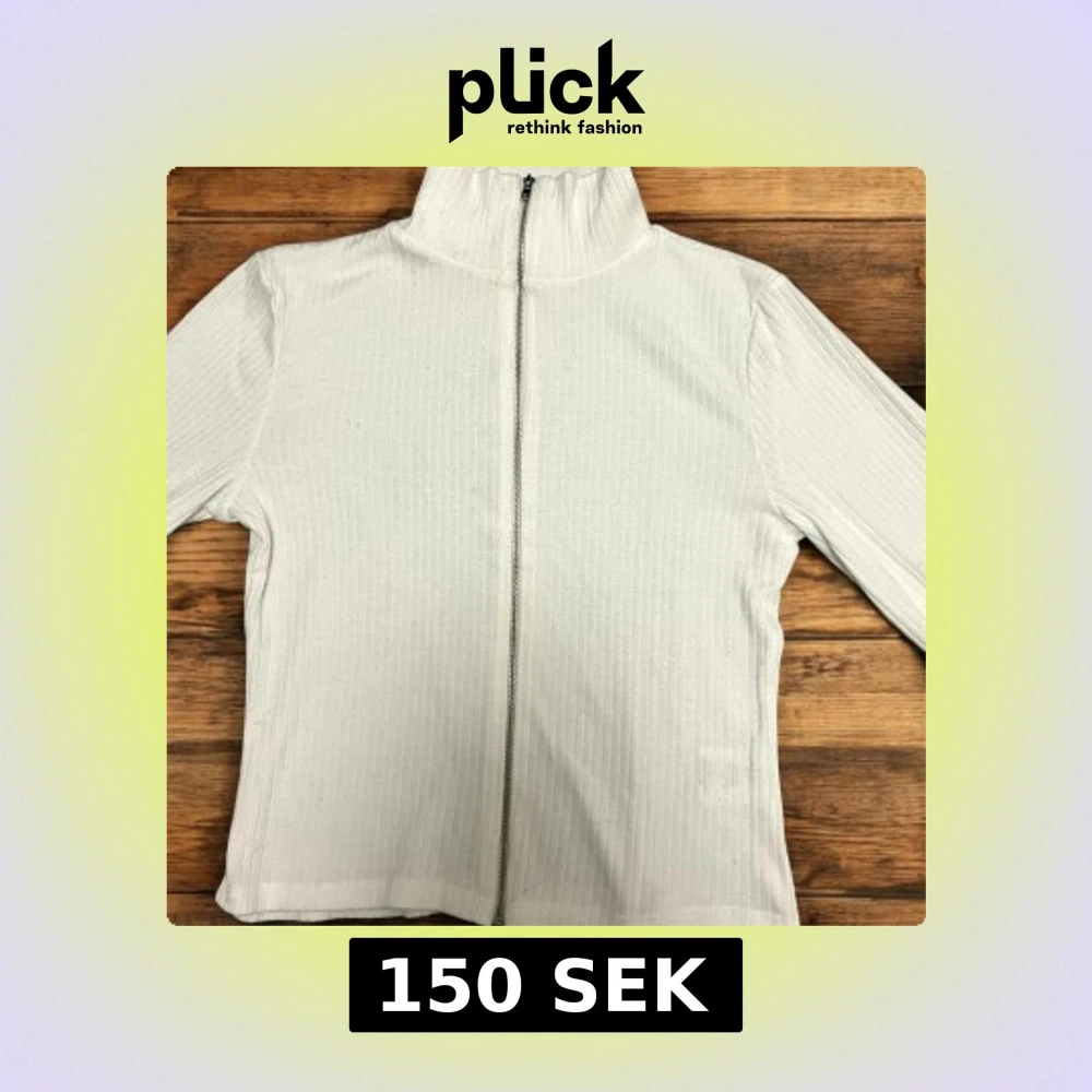 Säljer en vit ribbad kofta med hög krage och hel dragkedja framtill. Kofta har lång ärm och en enkel, stilren design som passar perfekt till vardags. Materialet är mjukt och stretchigt för extra komfort. Koftan är one size, dock skulle den passa bra för dig som har storlek Xxs, xs, s och m