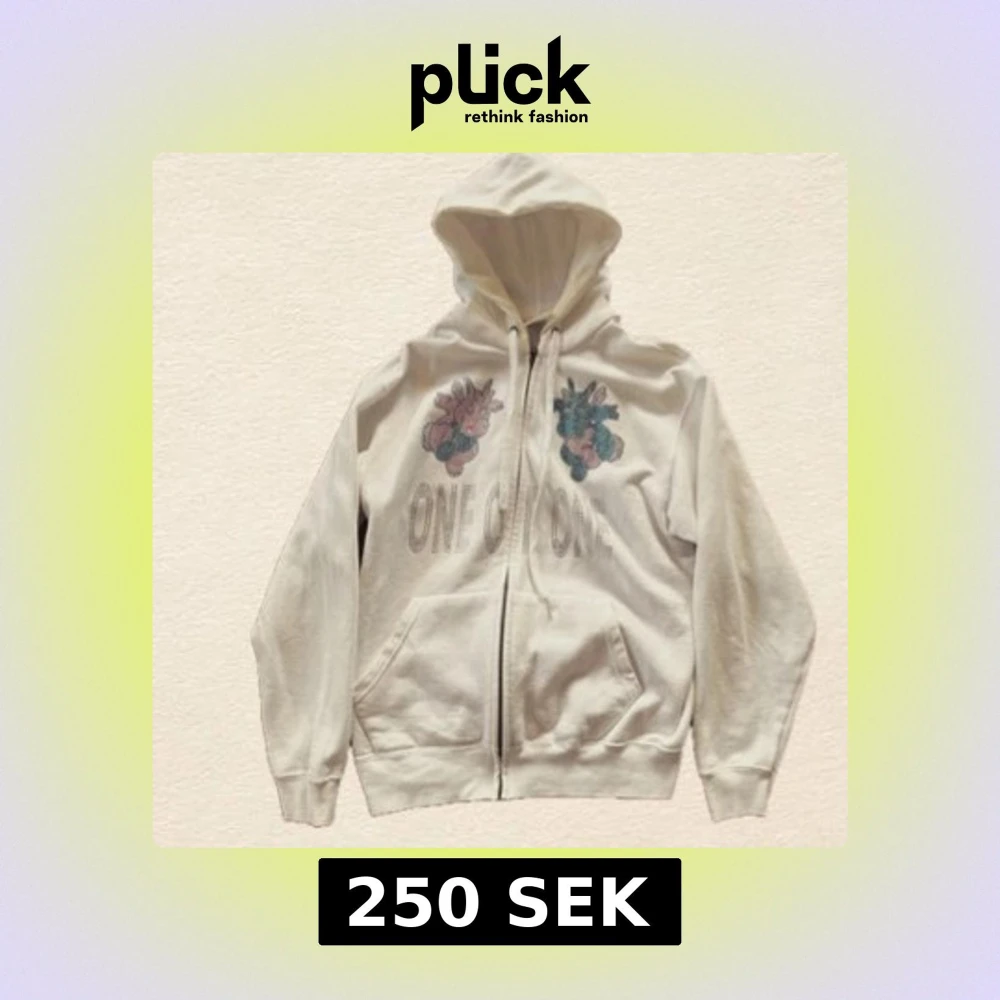 Vit hoodie med dragkedja och huva från One Of One. Framsidan har ett tryck med två färgglada figurer och texten 'ONE OF ONE'. Tröjan har kängurufickor och ribbade muddar. Mindre avfärgning.