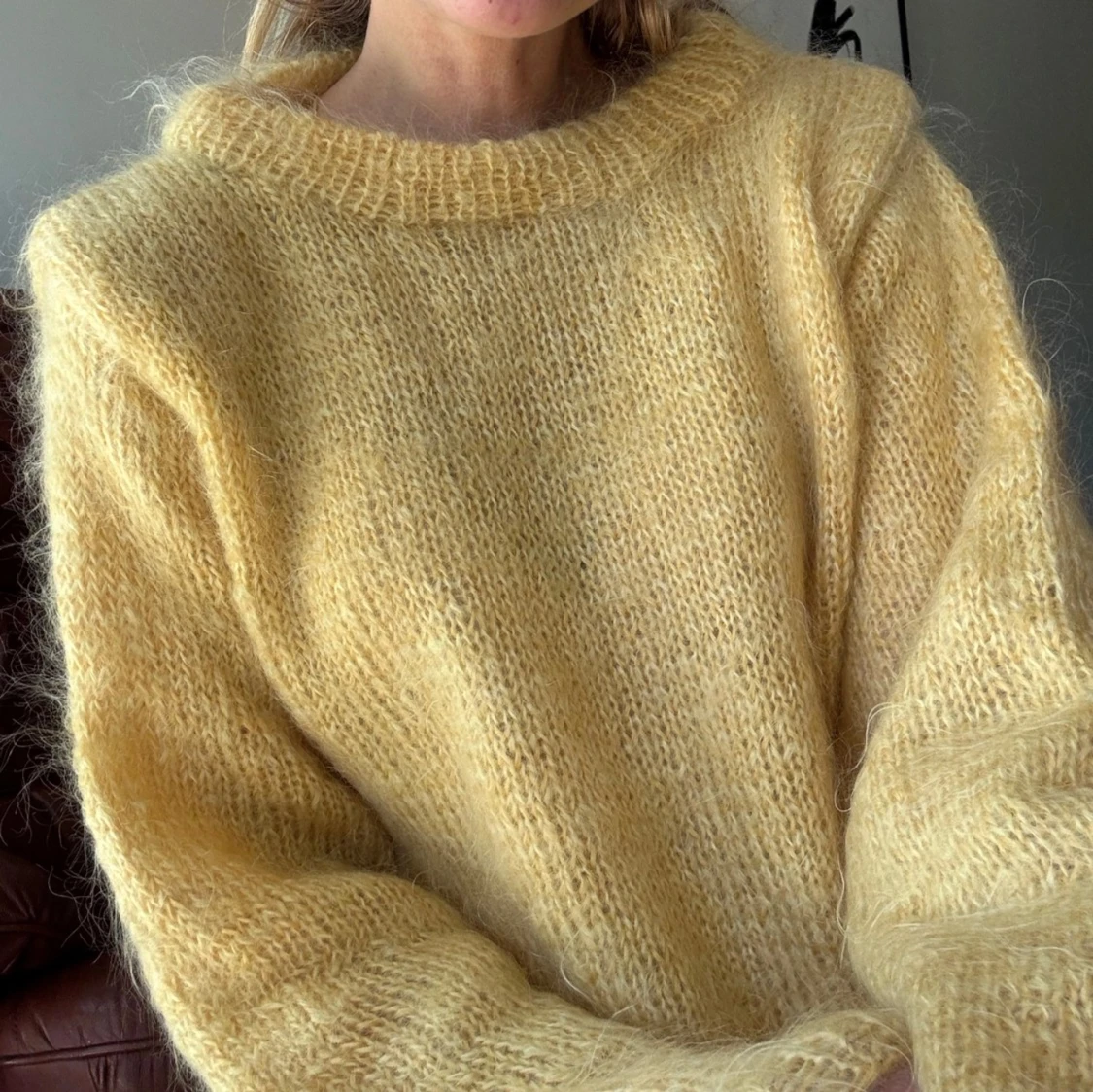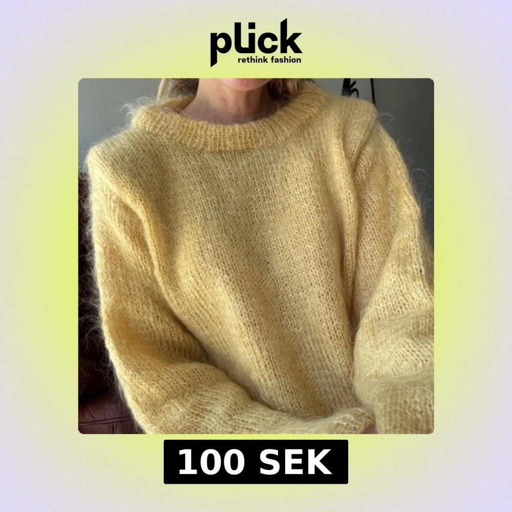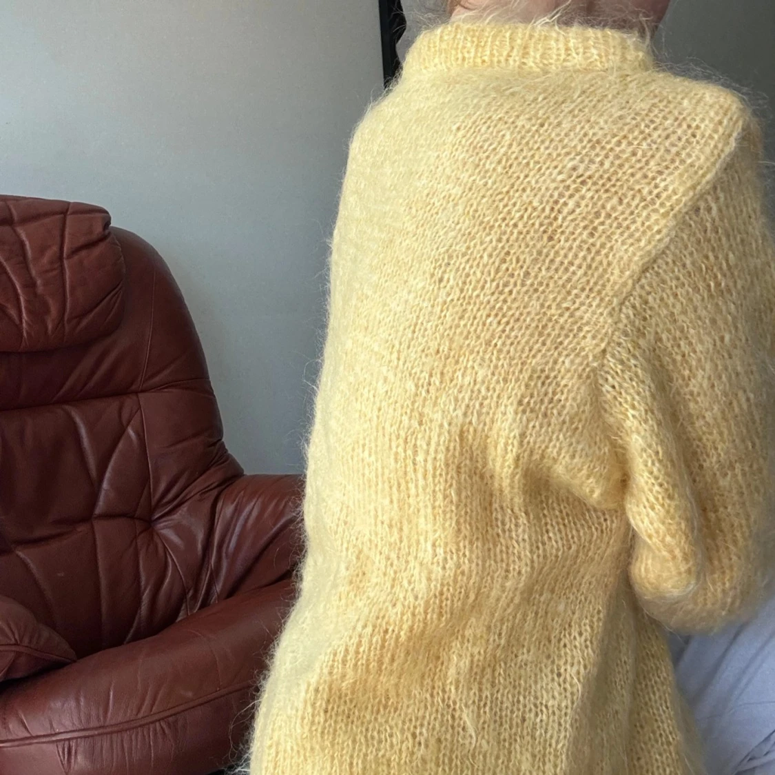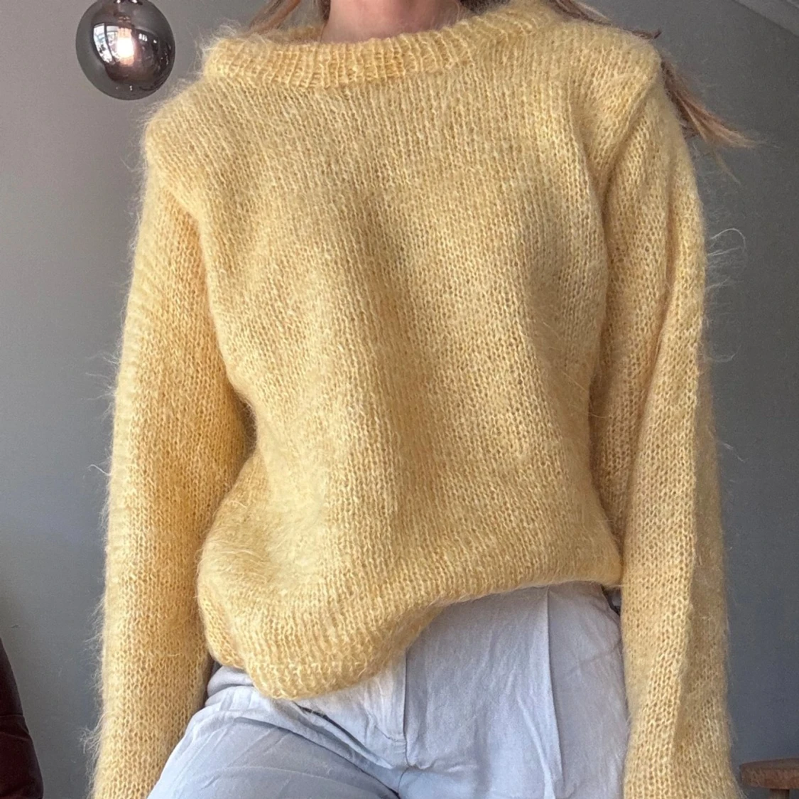 Supermysig gul stickad tröja med fluffig känsla och bred ribbad krage. Tröjan har en lös passform och långa ärmar. Fint skick!