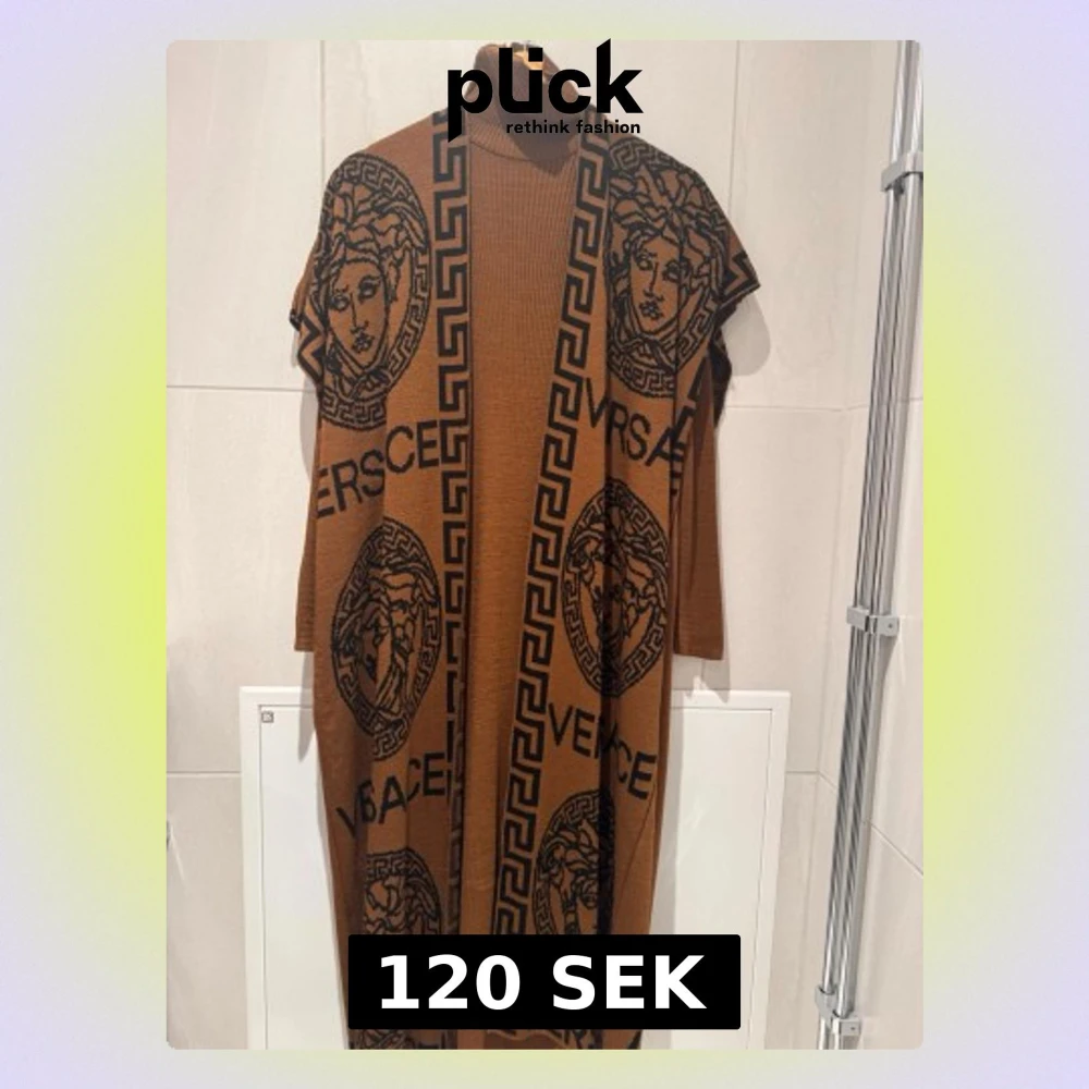 Snygg brun lång kofta med klänning undertill. Materialet är stickat och känns mjukt och lyxigt. Perfekt för att ge din outfit en exklusiv touch.