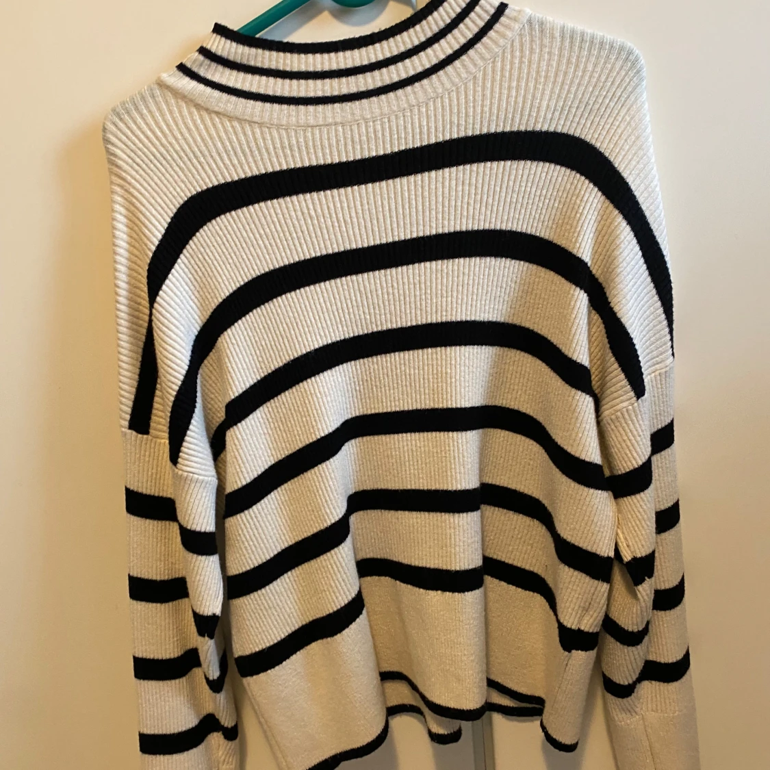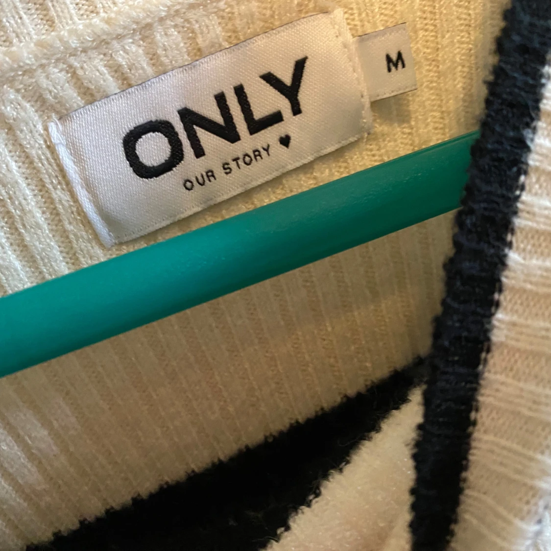 Säljer en snygg randig tröja från ONLY i svart och vit. Tröjan har långa ärmar och en ribbad struktur som ger en skön passform. Perfekt för en stilren look.