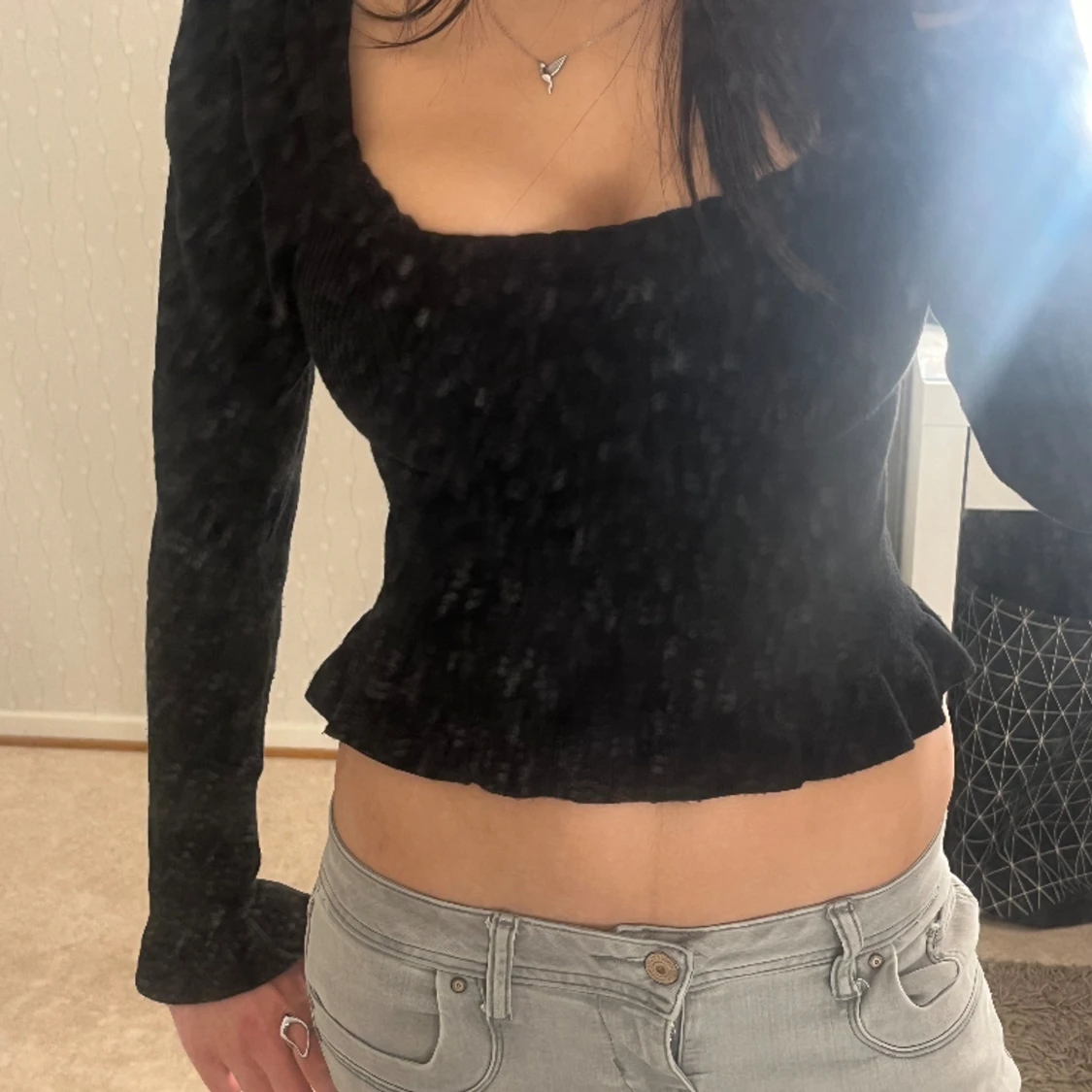 Säljer min svarta långärmade tröja med volangdetaljer längst kanten och vid händerna. Säljer då den inte kommer till användning 🥰💗
