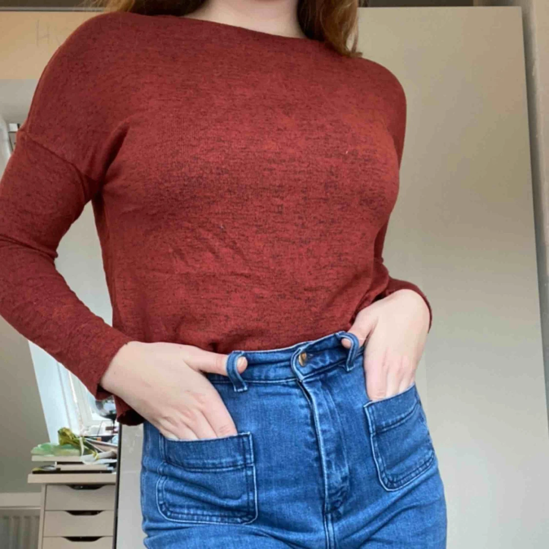 Tunn långärmad tröja med röd/svart spräcklig färg. Står XS i den men den passar en S. Lite kortare än en vanlig tröja. Frakt tillkommer. Skriv för mer info.