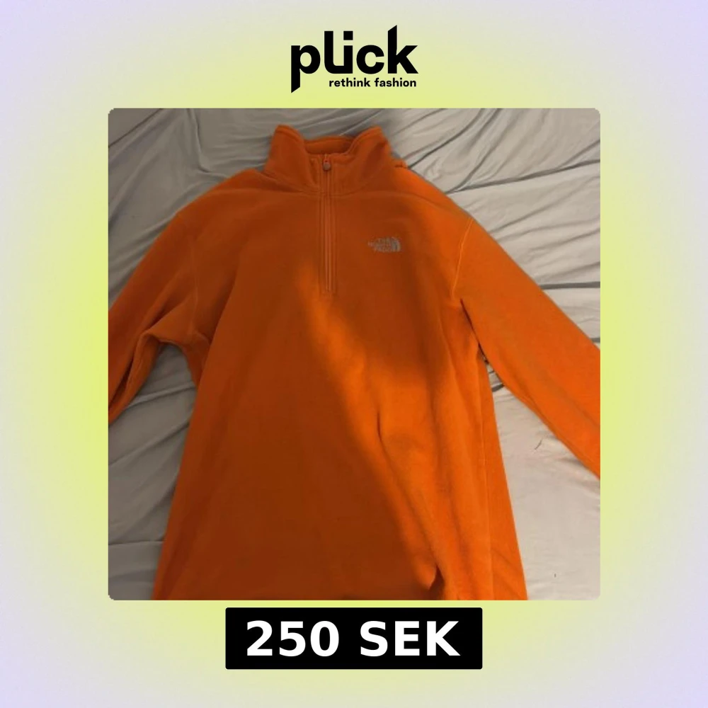 Säljer en orange fleece tröja från The North Face med halv dragkedja och hög krage. Perfekt för kyliga dagar och utomhusaktiviteter. Tröjan har långa ärmar och är supermjuk och bekväm.