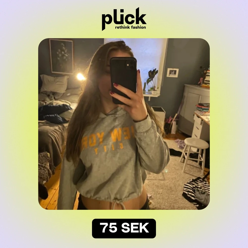 Säljer en supermysig grå hoodie från H&M med oranget tryck på framsidan, man kan dra åt den där nere för att justera passformen också🫶🏻🫶🏻