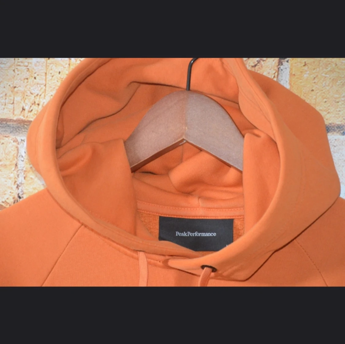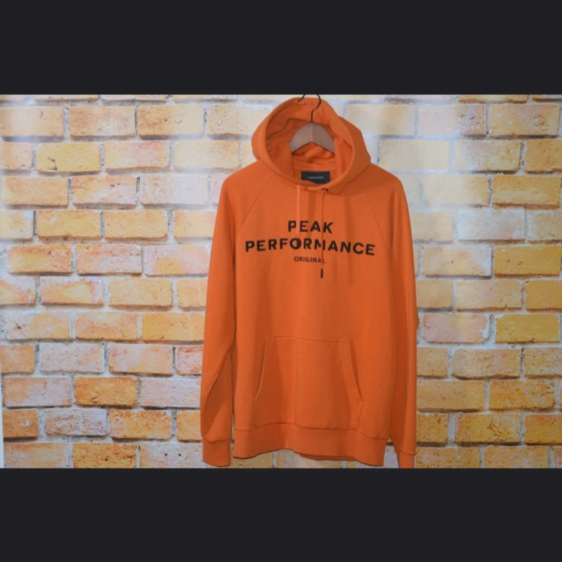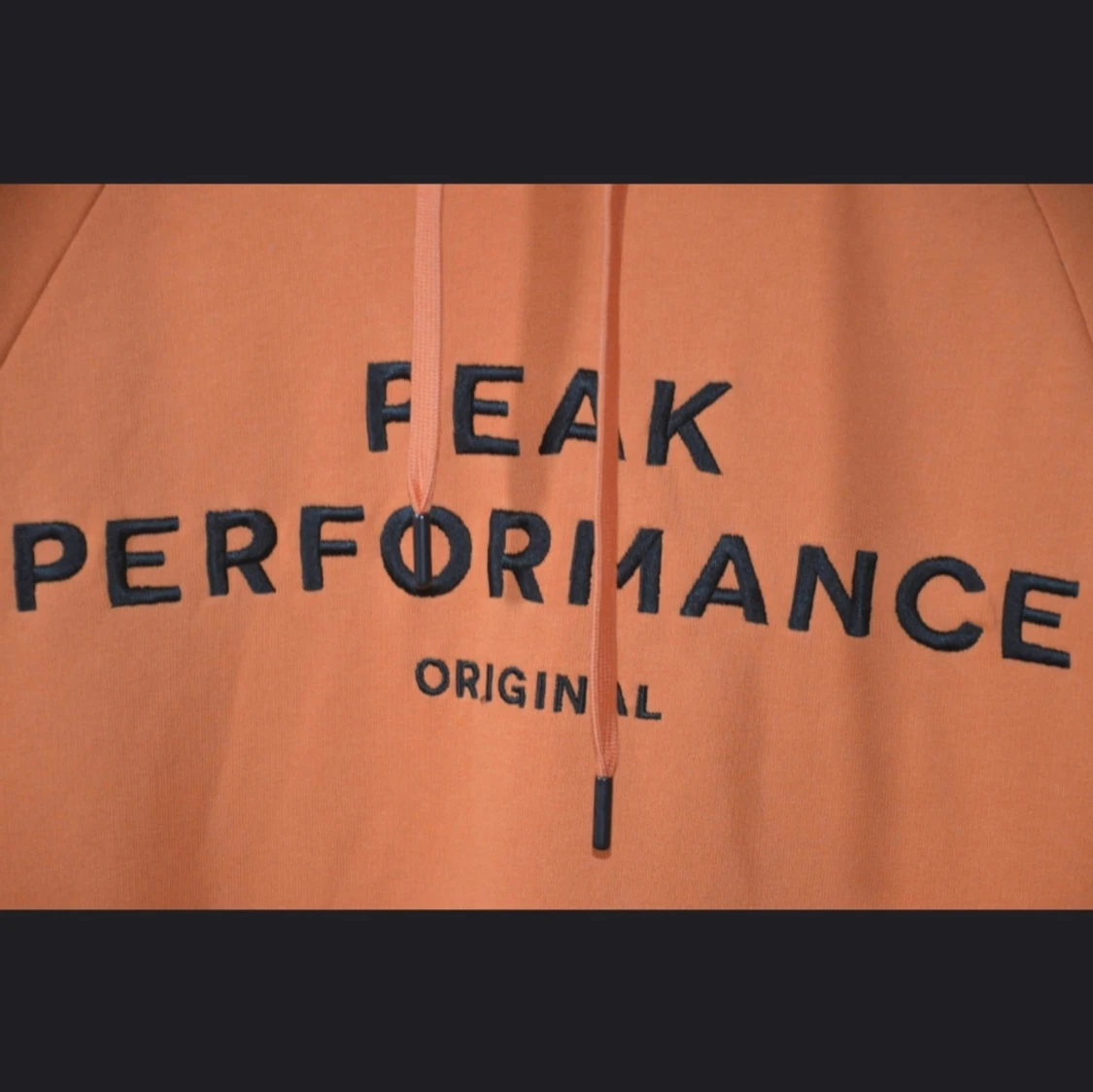 Snygg orange hoodie från Peak Performance med svart broderad logga på bröstet. Tröjan har huva med dragsko, känguruficka och långa ärmar. Perfekt för dig som gillar streetwear och vill sticka ut med en färgstark look.