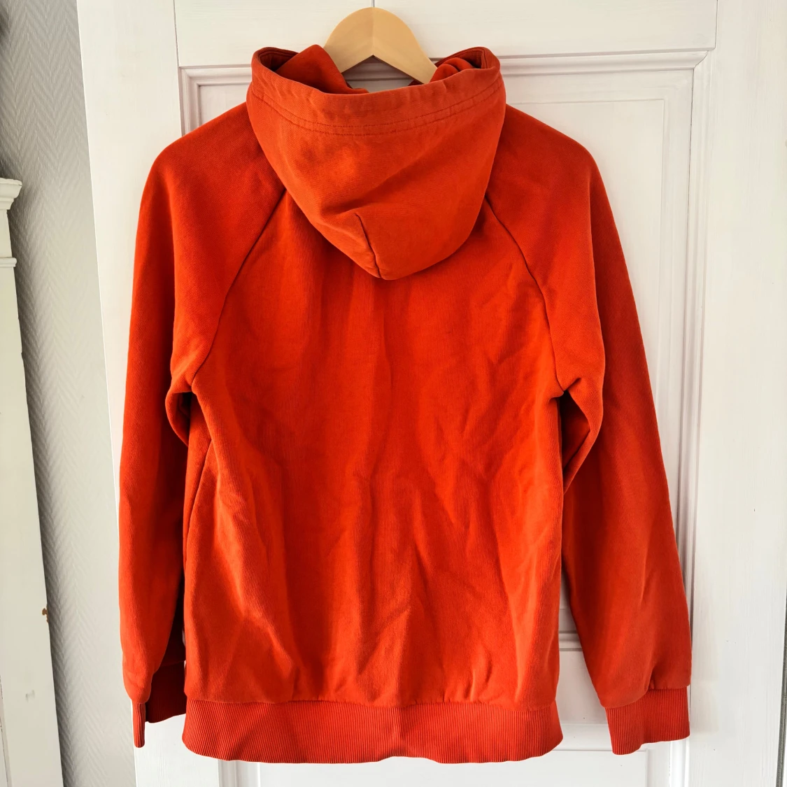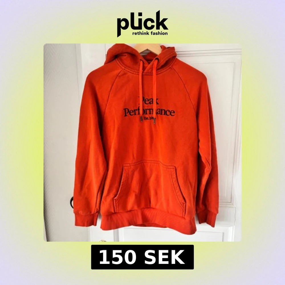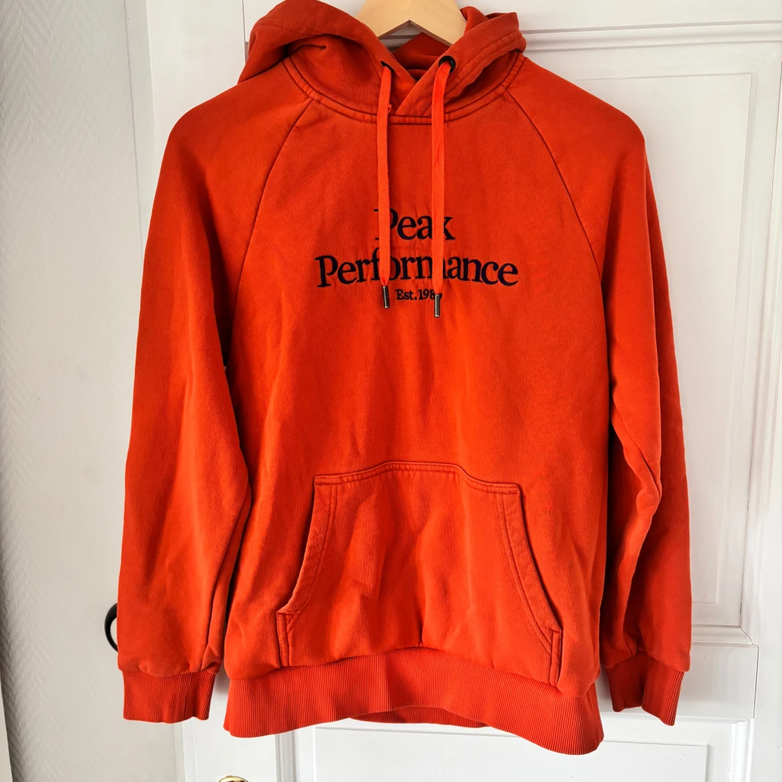 Säljer en orange hoodie från Peak Performance med broderad logga på bröstet. Tröjan har huva med dragsko och en stor magficka. Perfekt för dig som gillar en sportig och avslappnad stil.