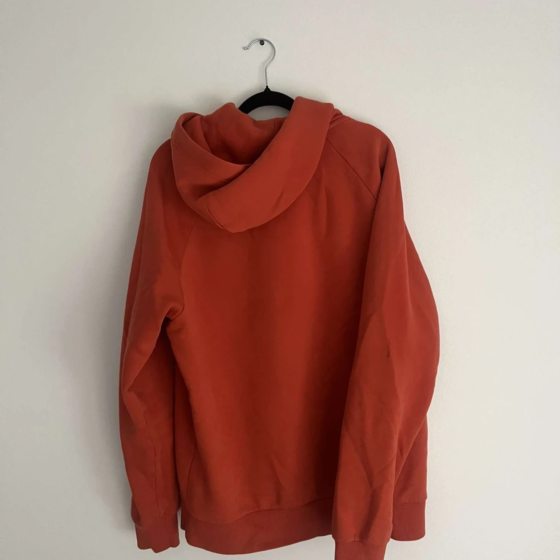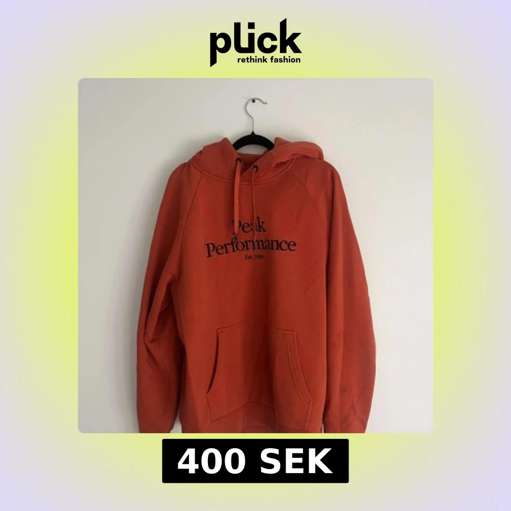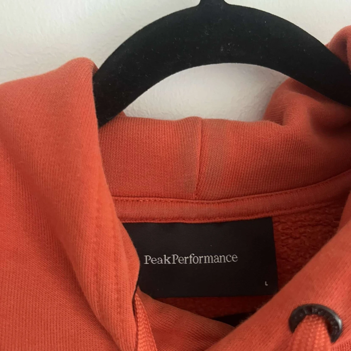 Säljer en orange hoodie från Peak Performance med svart tryck på bröstet. Tröjan har huva med snörning, stor magficka och ribbade muddar. Perfekt för chill dagar och har en loose passform. Materialet är mjuk bomull som känns skönt mot huden.