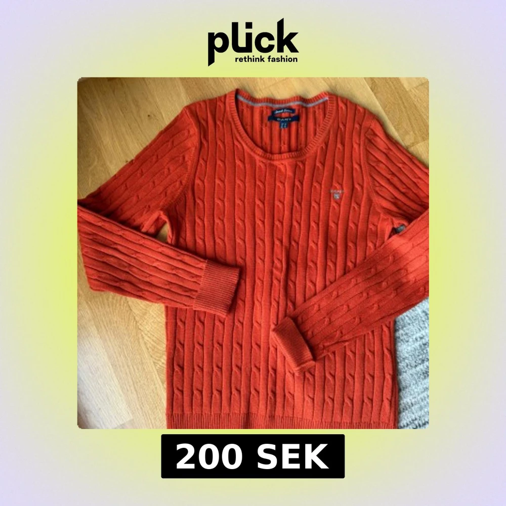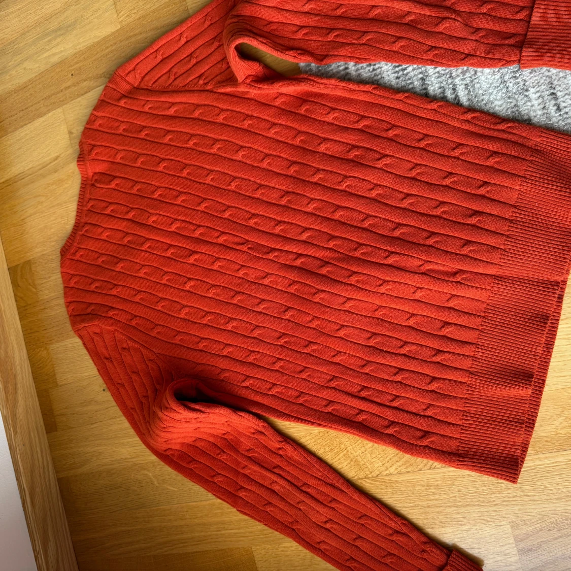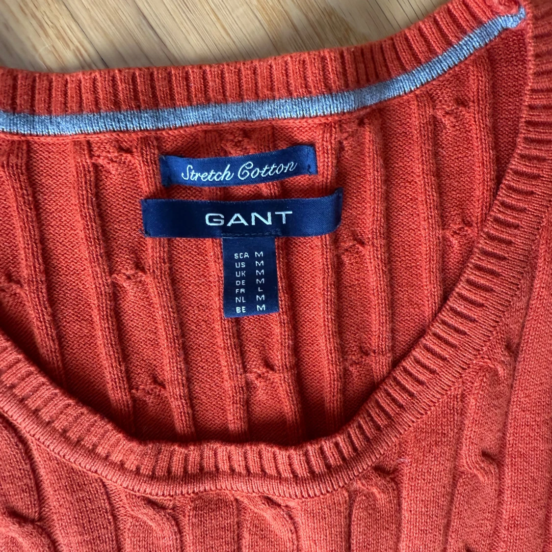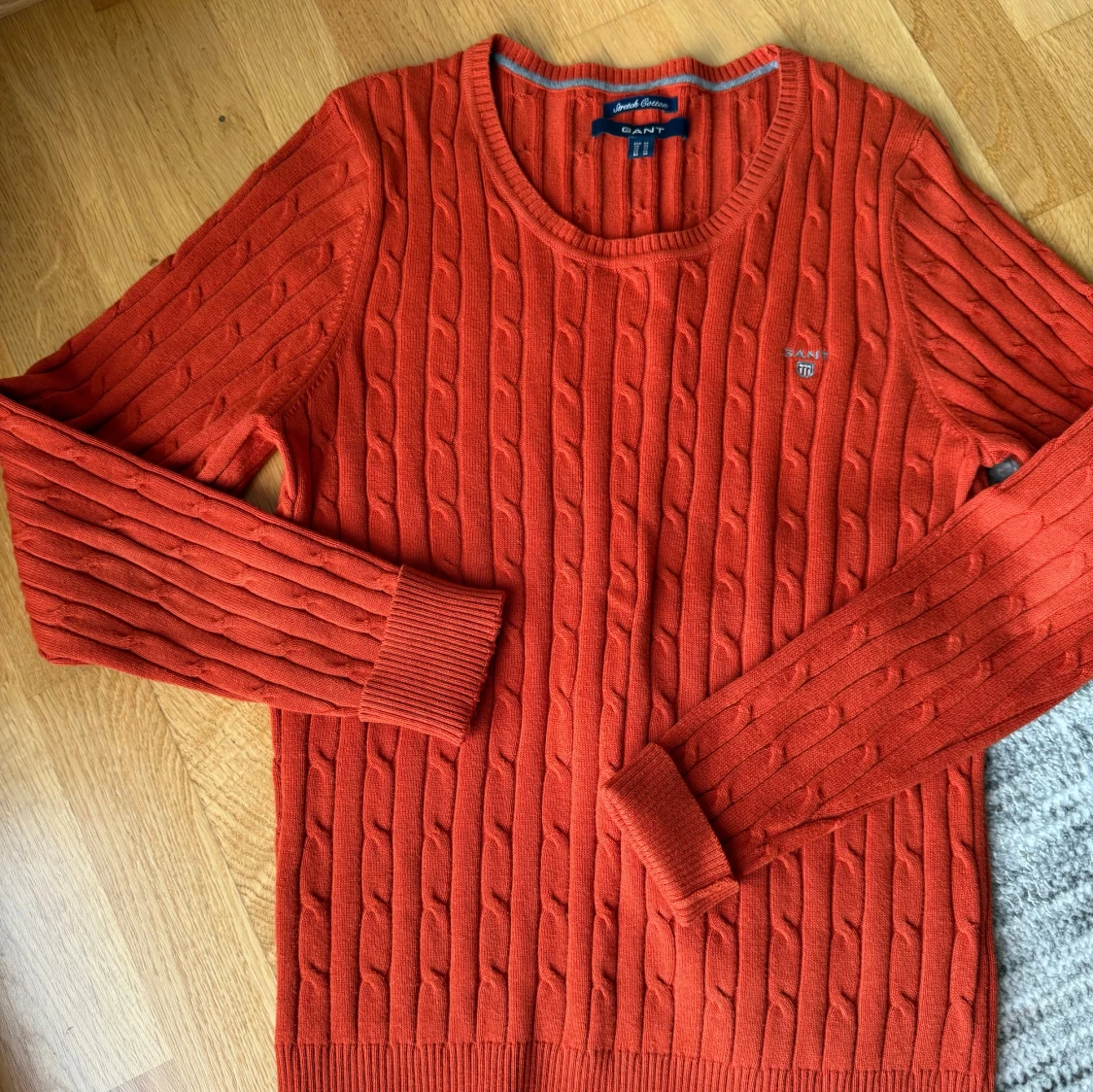 Kabelstickad orange tröja från GANT. Klassisk rund halsringning, ribbade muddar och diskret logga broderad på bröstet.