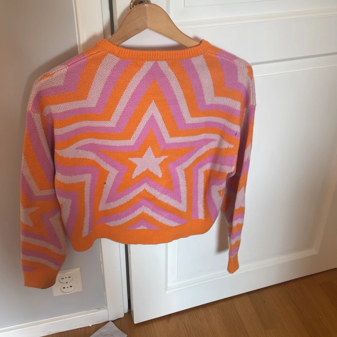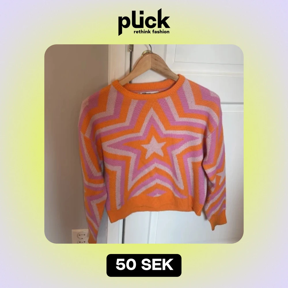 Säljer en supercool och färgglad stickad tröja med ett stort stjärnmönster i orange, rosa och lila. Tröjan har en normal passform och långa ärmar, perfekt för att liva upp vilken outfit som helst. Den är i nyskick och redo för nya äventyr!