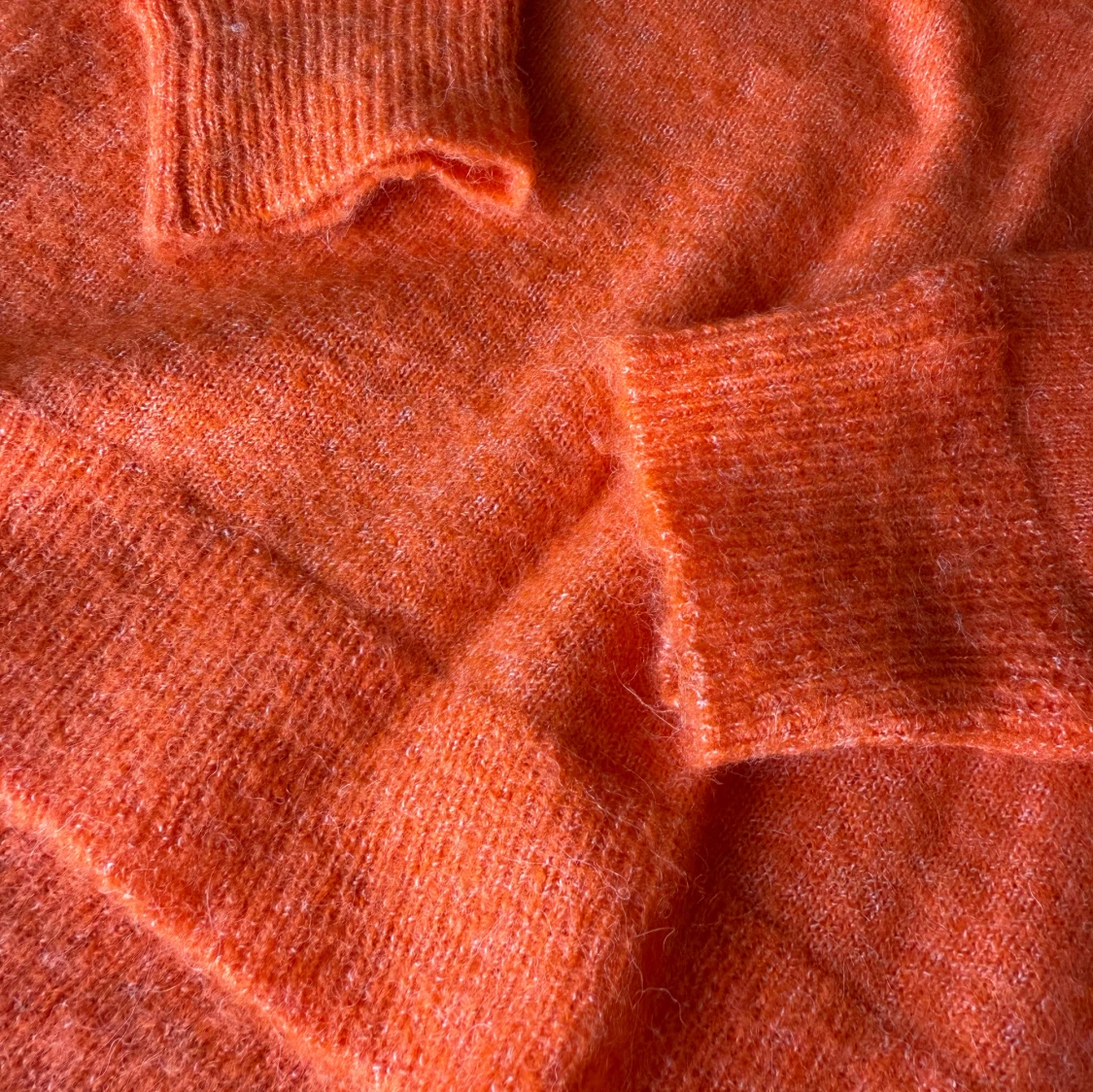 Supermjuk och fluffig orange stickad tröja från Selected Femme. Tröjan har rund hals, långa ärmar och breda ribbade muddar vid ärmslut och nederkant. Perfekt för lager-på-lager och ger en färgklick till din outfit.