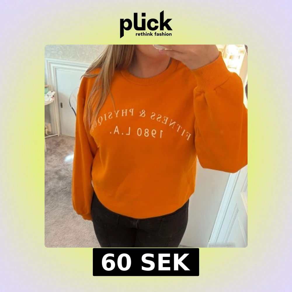 Cool orange sweatshirt från Gina Tricot med vit text 'Fitness & Physique 1980 L.A.' framtill. Tröjan har rund hals, långa ärmar och en relaxed passform. Perfekt för dig som gillar färg och vill sticka ut lite extra. Mjuk insida och ribbade muddar.