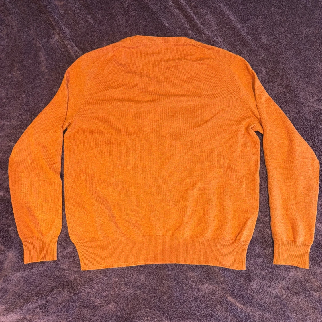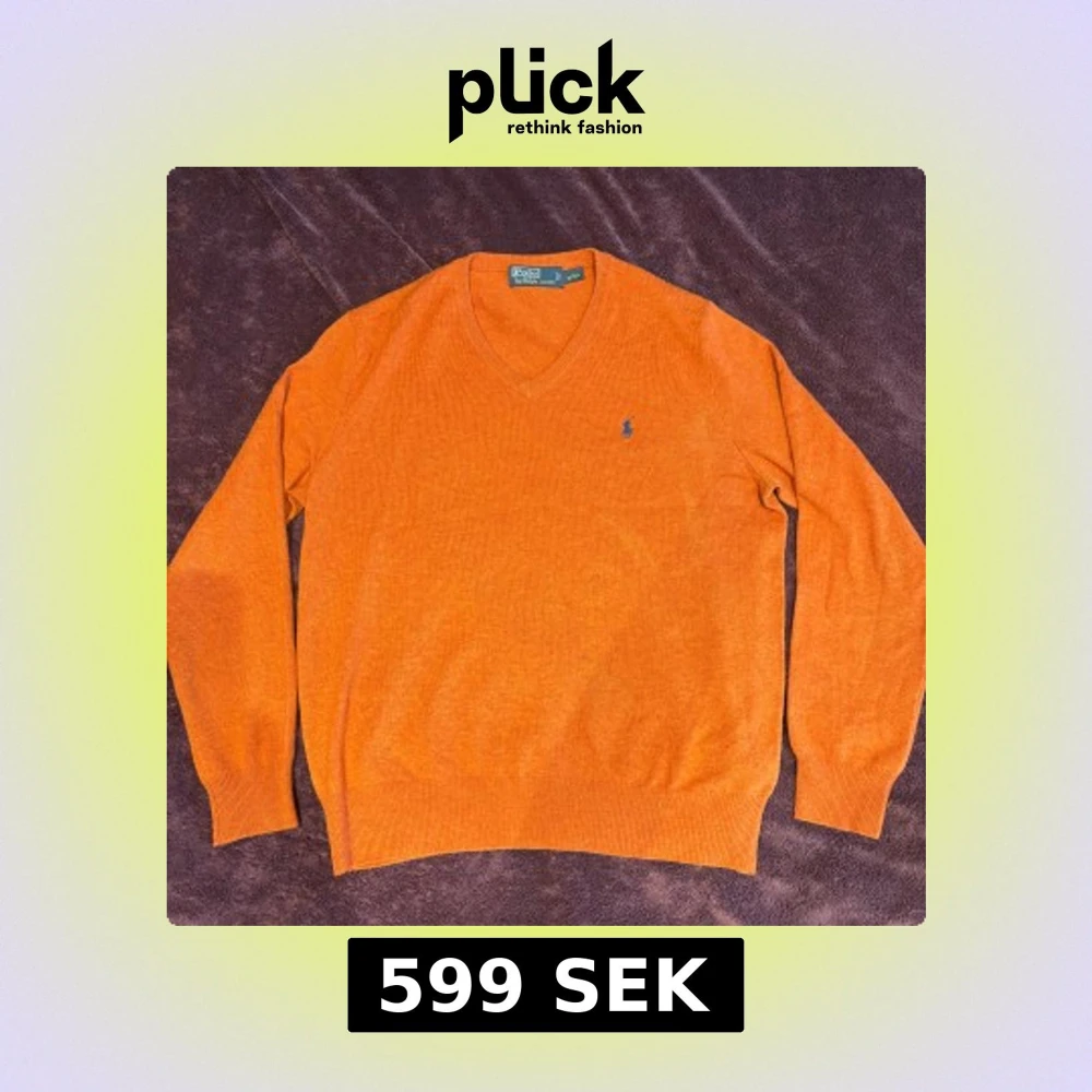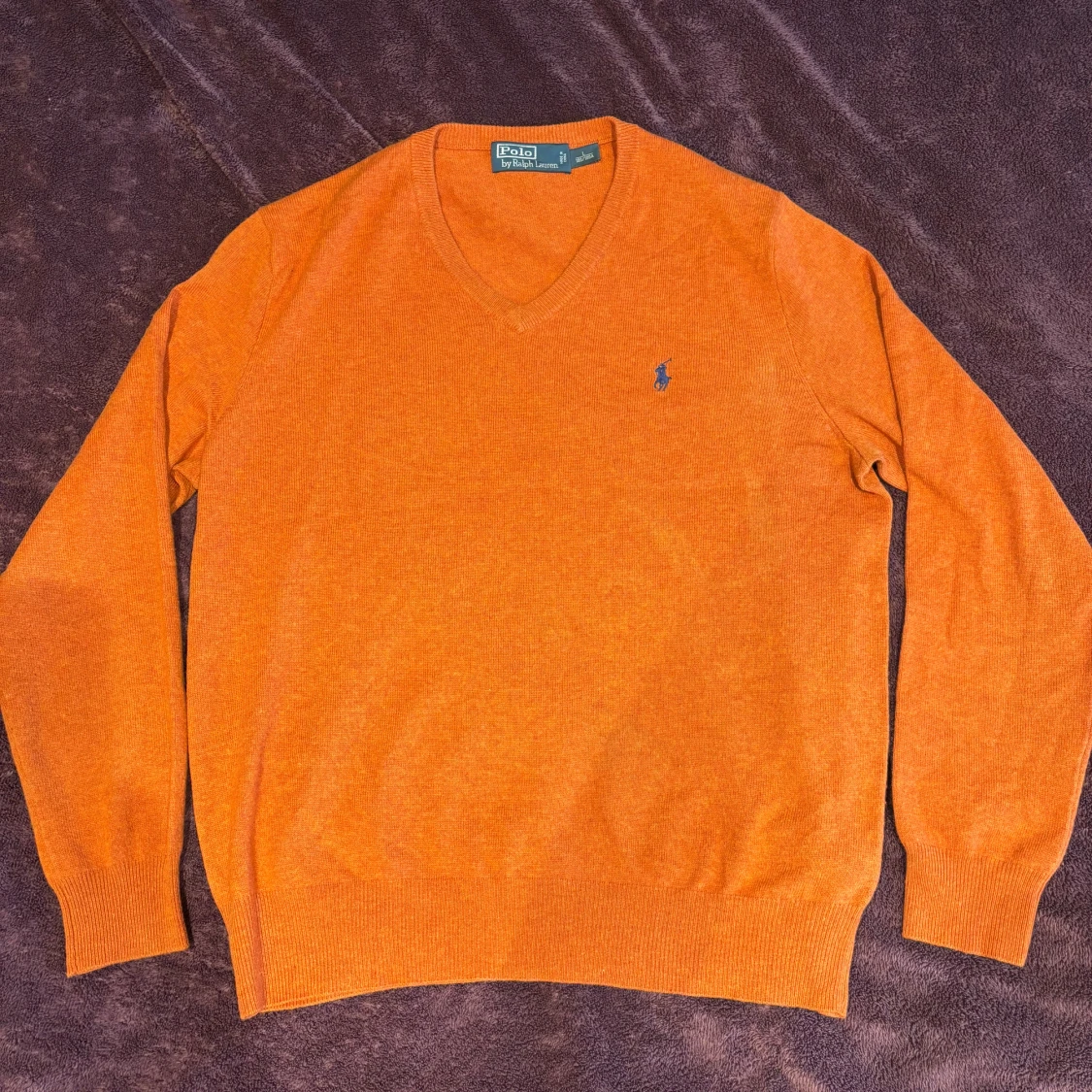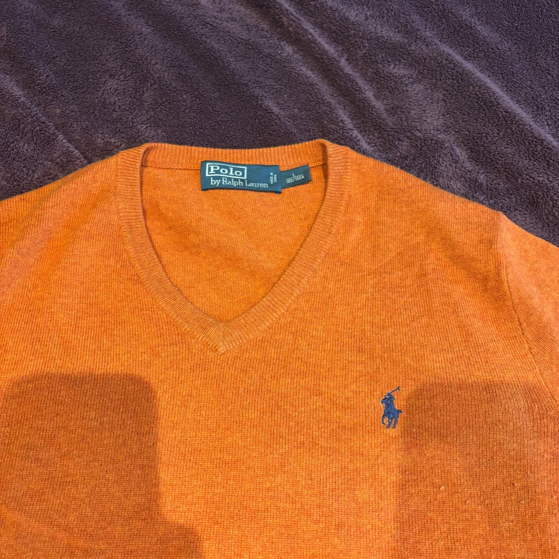 Säljer en snygg orange tröja från Polo Ralph Lauren med v-ringning och broderad logga i blått på bröstet. Tröjan har långa ärmar och ribbade muddar vid ärmslut och nederkant. Perfekt för en stilren look!