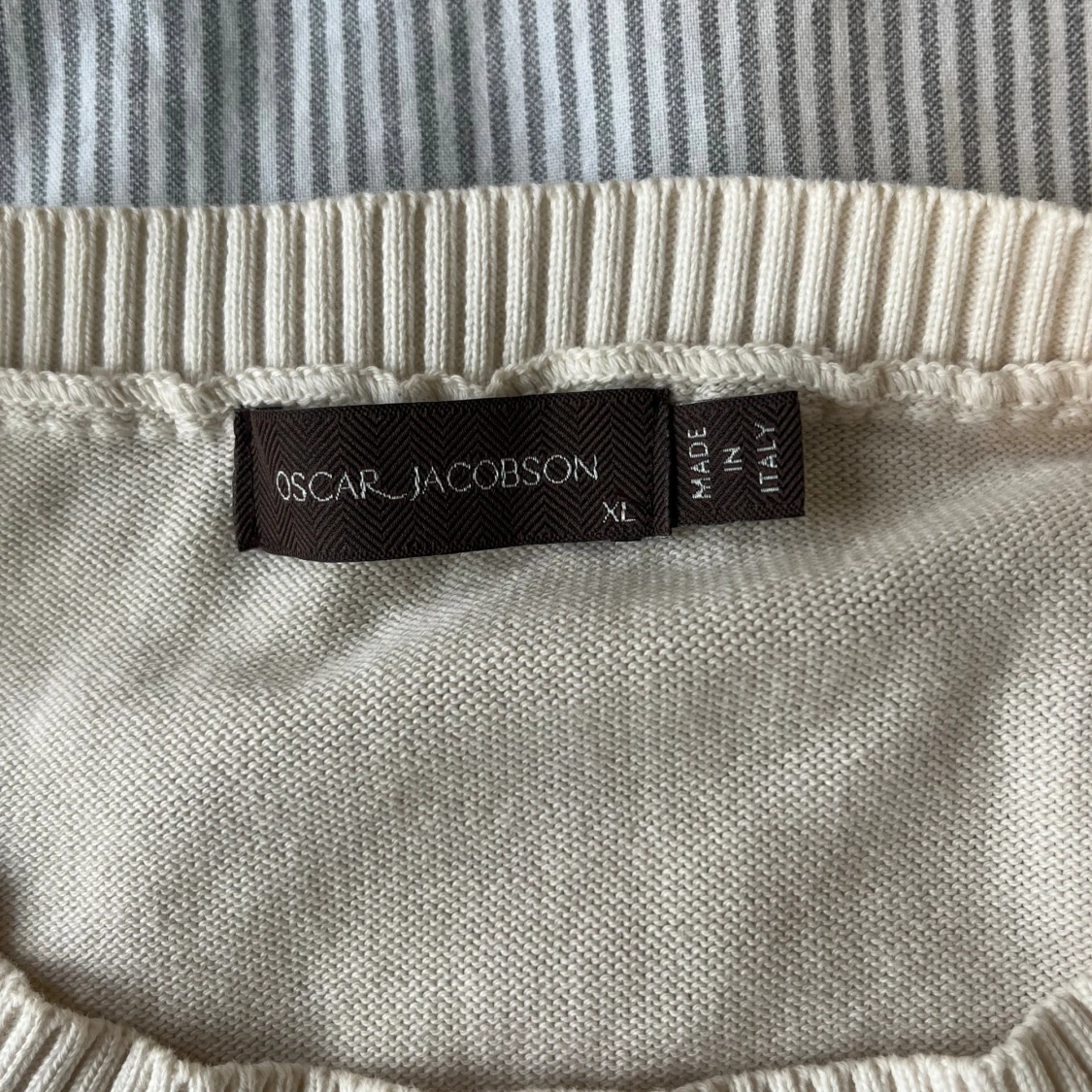 Snygg beige stickad tröja från Oscar Jacobson i storlek XL(sitter som L). Tröjan har en klassisk rund hals med ribbad kant och är tillverkad i Italien. Perfekt för dig som gillar stilrena och enkla plagg med premiumkänsla.