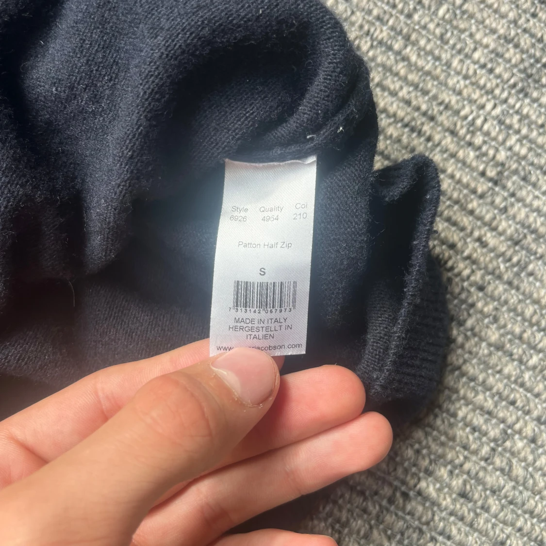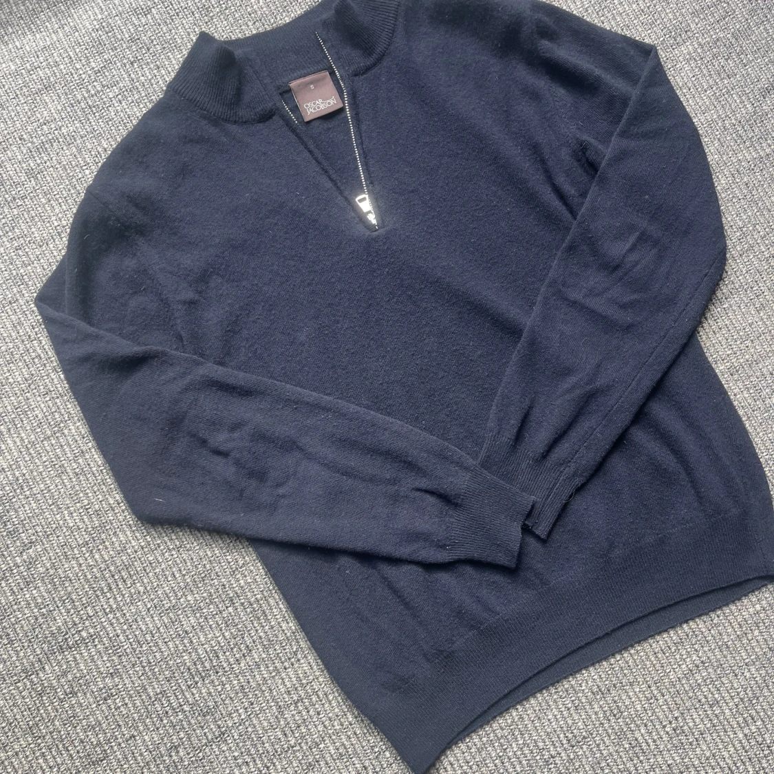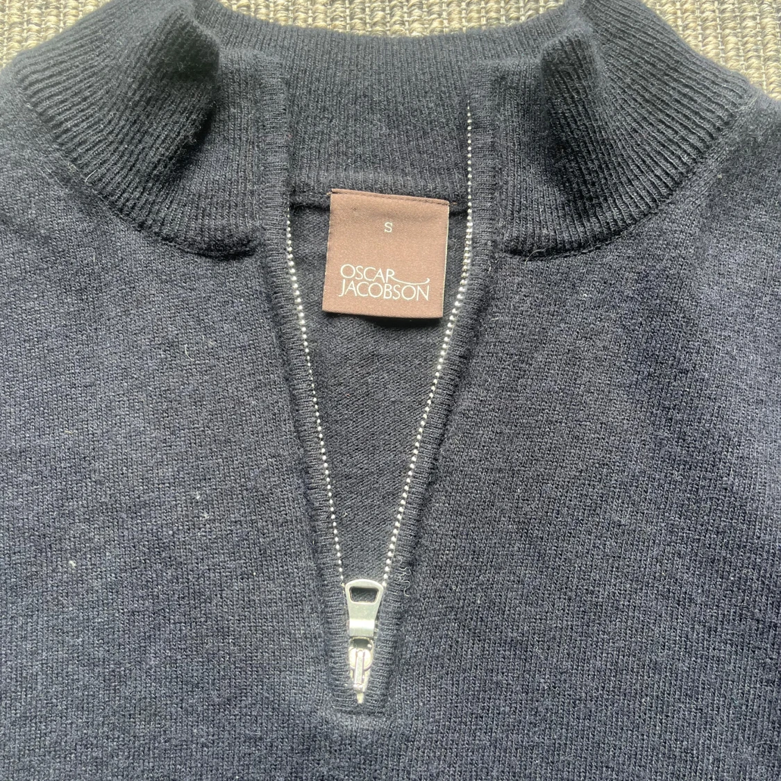Klassisk mörkblå långärmad tröja från Oscar Jacobson med halv dragkedja och hög krage. Tillverkad i mjuk ull, perfekt för lager-på-lager. Snygg ribbad mudd vid ärmslut och nederkant. Made in Italy – stilren och tidlös design. Väldigt fint skick🤩Hör av er vid frågor och funderingar👏 svarar ofta snabbt🙌kom gärna med prisförslag så kan vi säkert lösa något som funkar för båda😄
