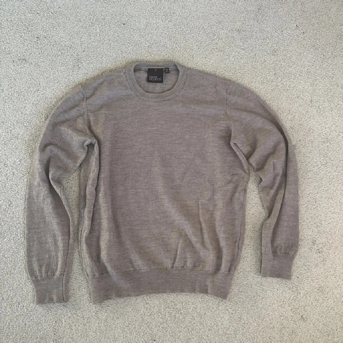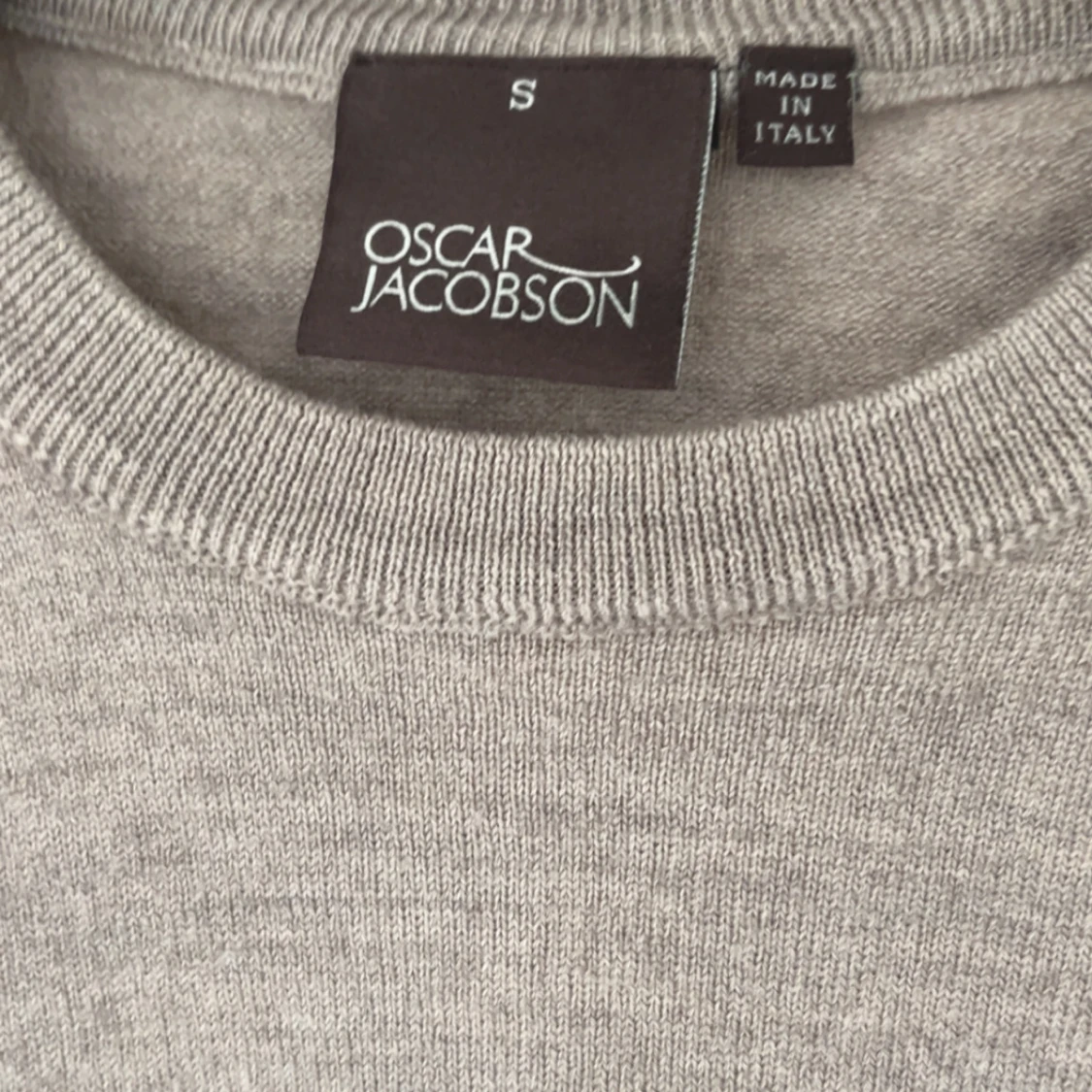 Snygg beige rundhalsad tröja från Oscar Jacobson i mjuk merinoull. Klassisk modell med ribbade muddar vid ärmslut och nederkant. Perfekt för lager-på-lager och funkar året runt. Tillverkad i Italien.