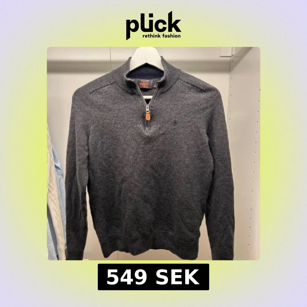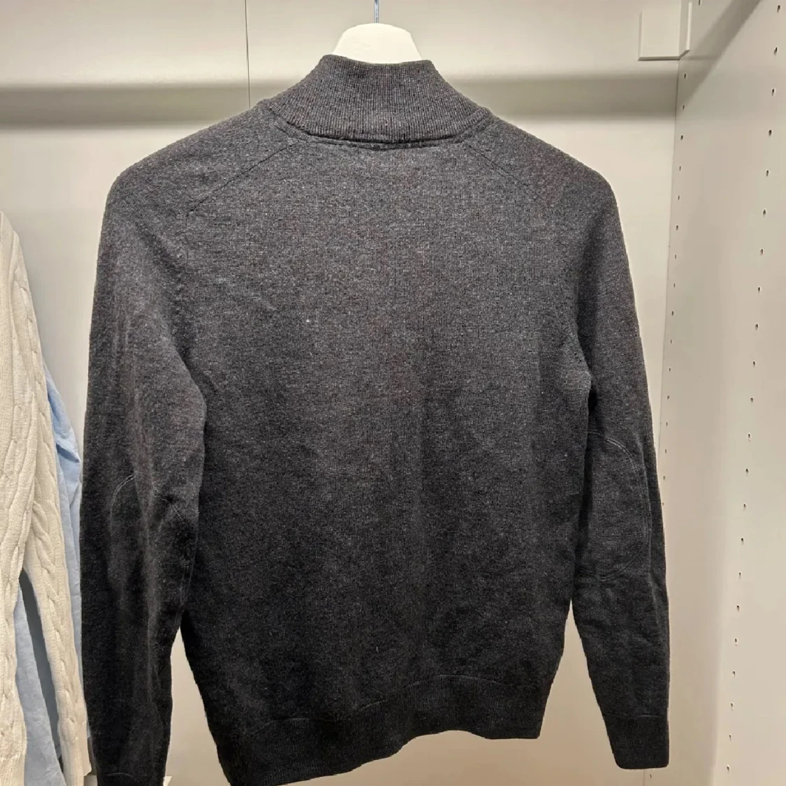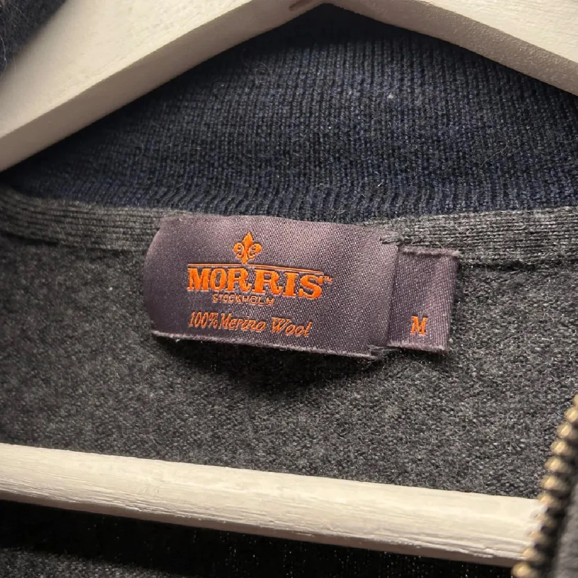 Snygg mörkgrå tröja från Morris i 100% merinoull. Tröjan har halv dragkedja framtill och ribbade muddar vid ärmslut och nederkant. Perfekt för lager-på-lager och stilren look. Tröjan är krympt från M till XS och är i väldigt bra skick