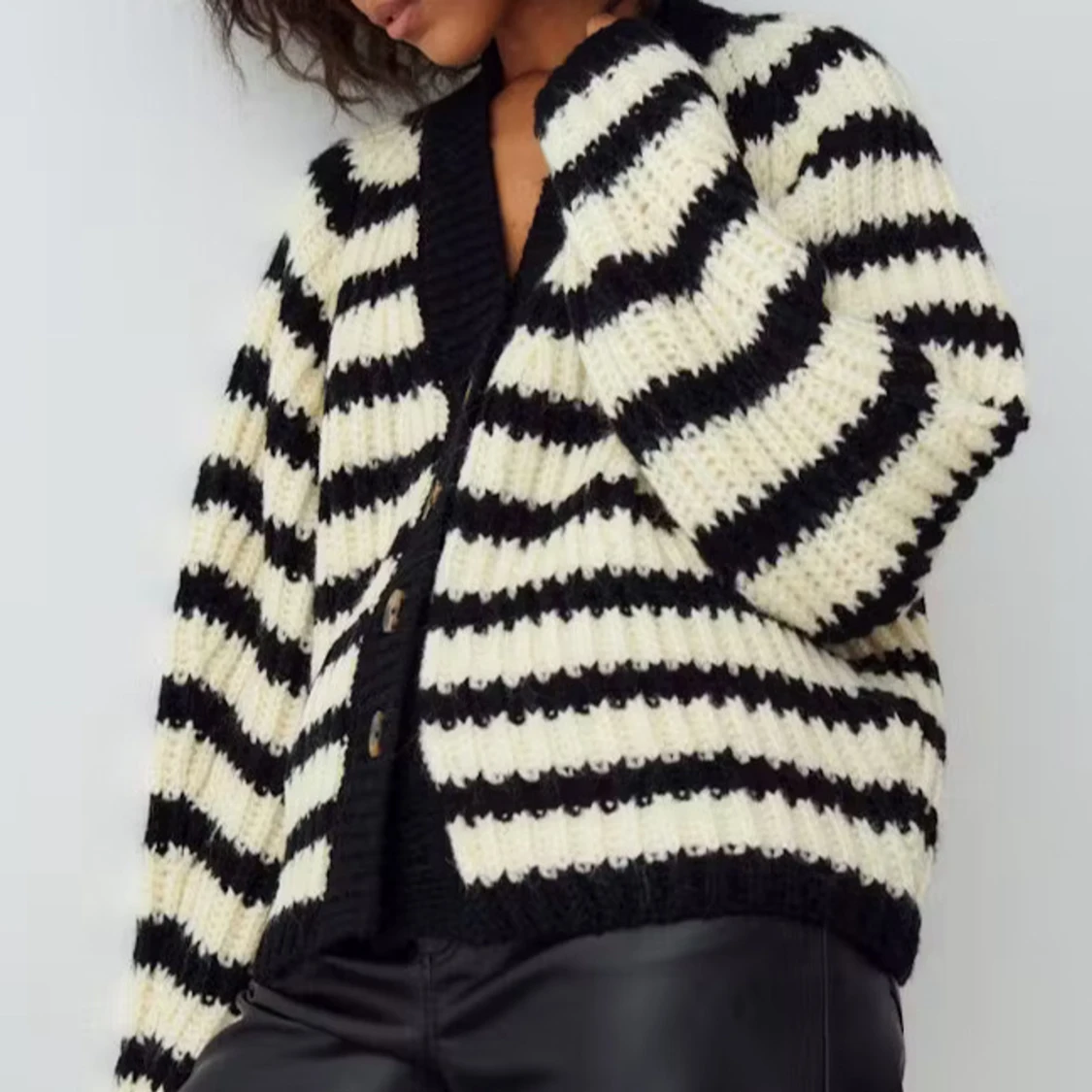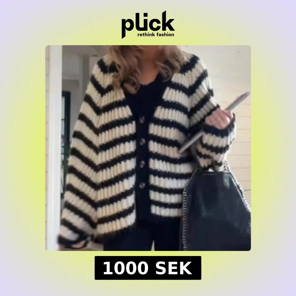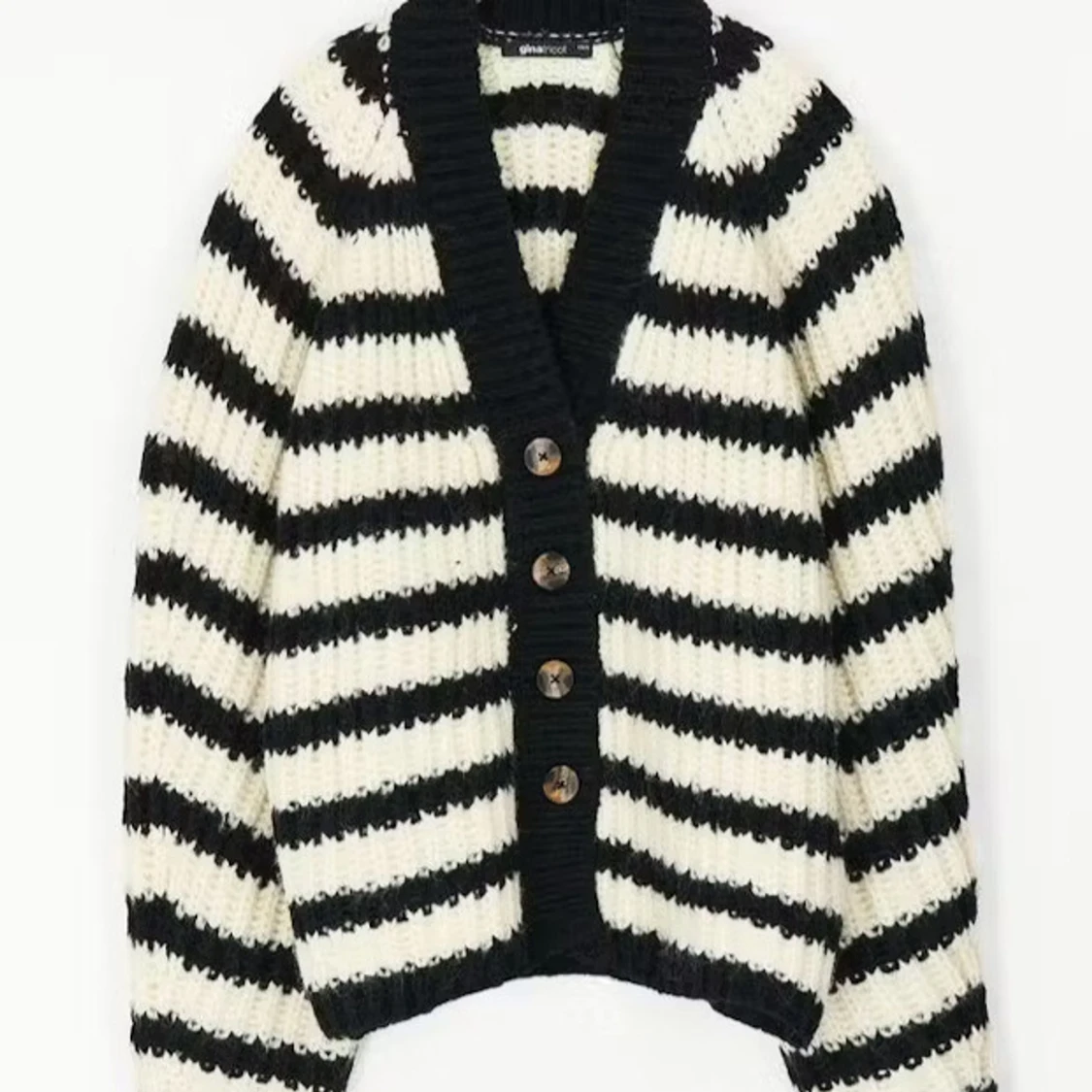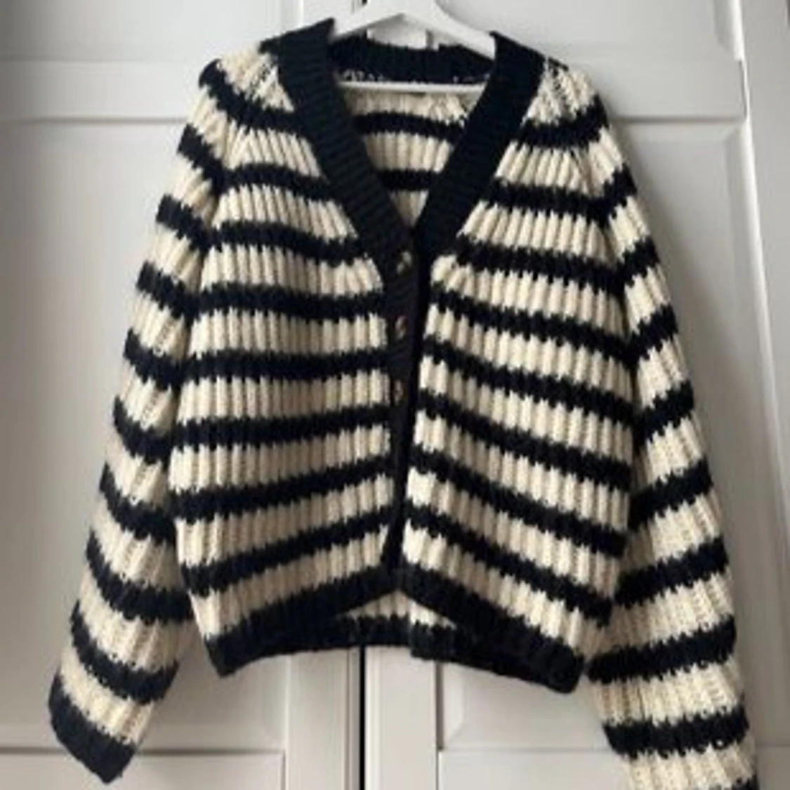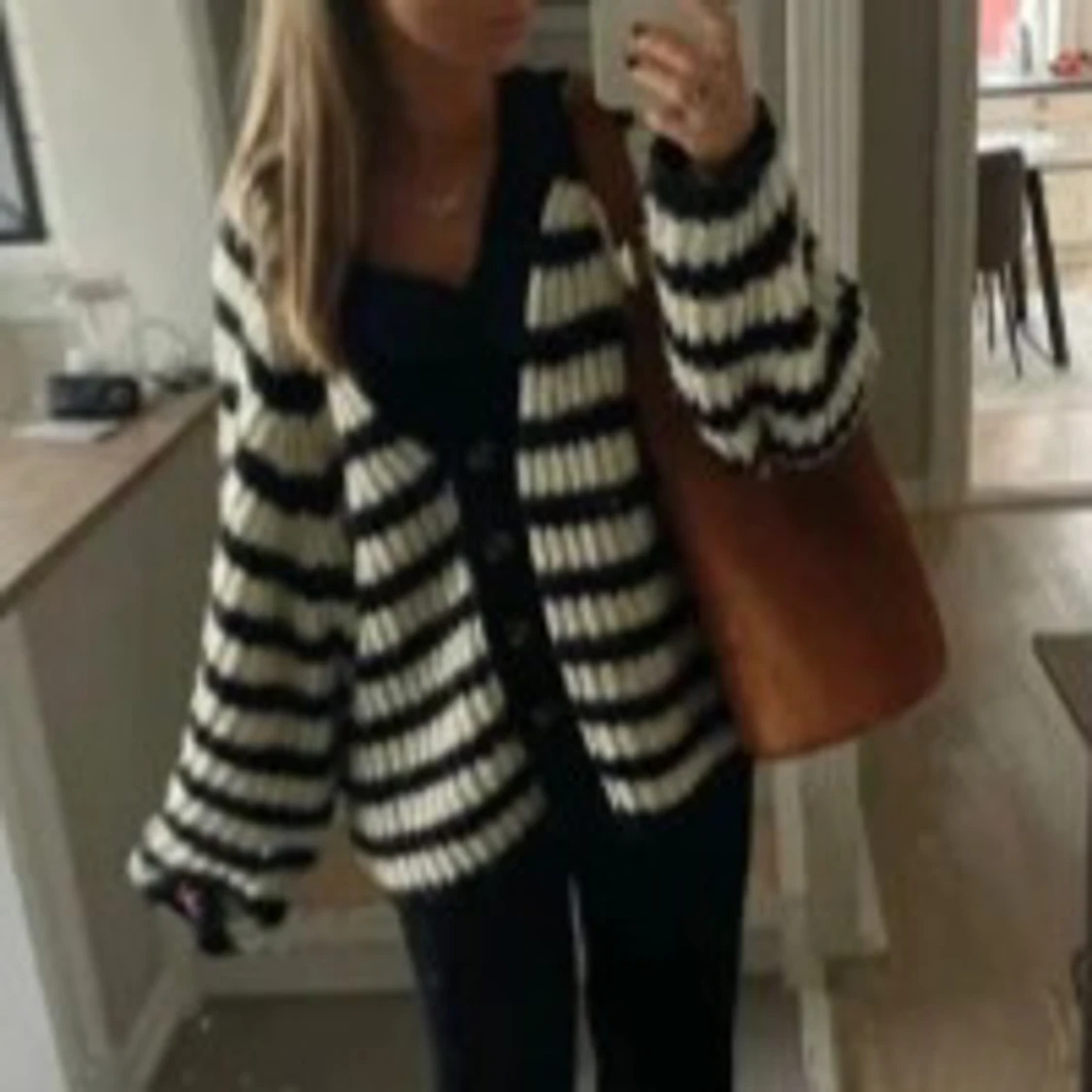 Supermysig stickad kofta från Gina Tricot med breda svarta och vita ränder. Koftan har v-ringning, stora knappar framtill och en loose passform🤗🤗