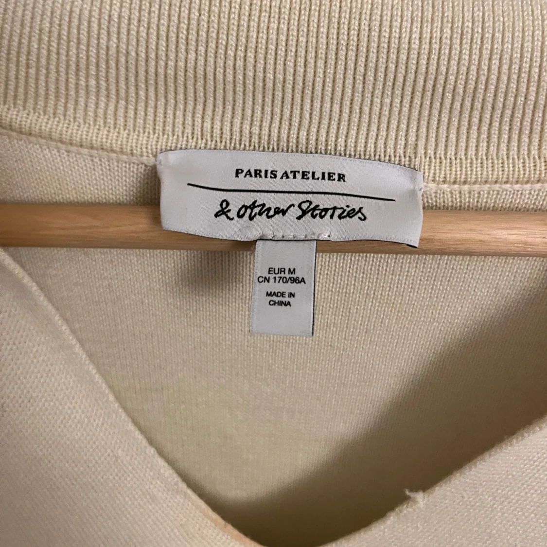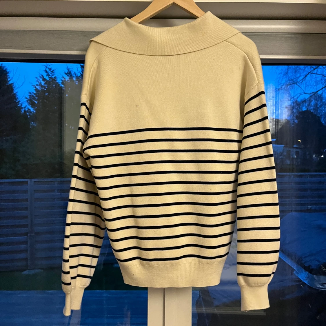 Säljer en stilren randig tröja från & Other Stories i beige och svart. Tröjan har en v-ringad hals och långa ärmar. Den är tillverkad i ett mjukt material som ger en skön passform.