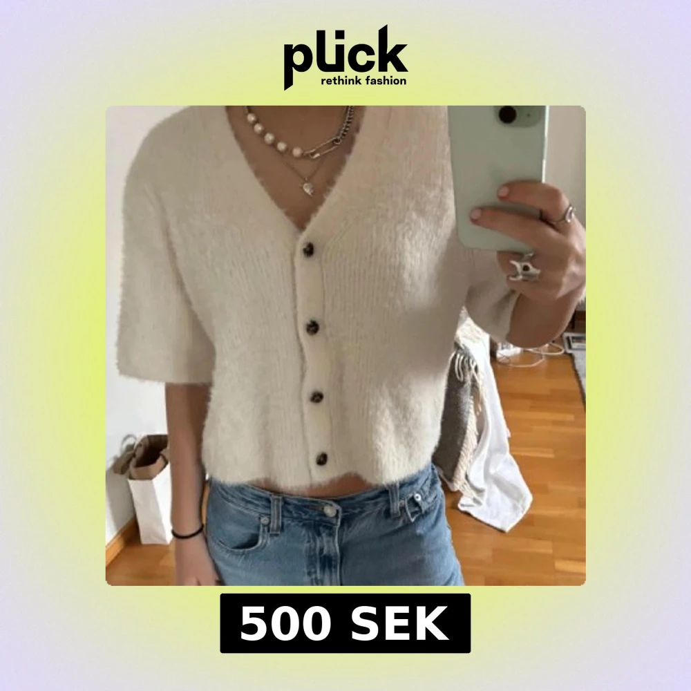 Superfin vit kofta från otherstories med croppad passform och korta ärmar. Tröjan är stickad och har en mjuk, fluffig känsla. V-ringad med svarta knappar framtill som ger en chill och trendig vibe. Perfekt att styla med jeans eller kjol för en snygg look.