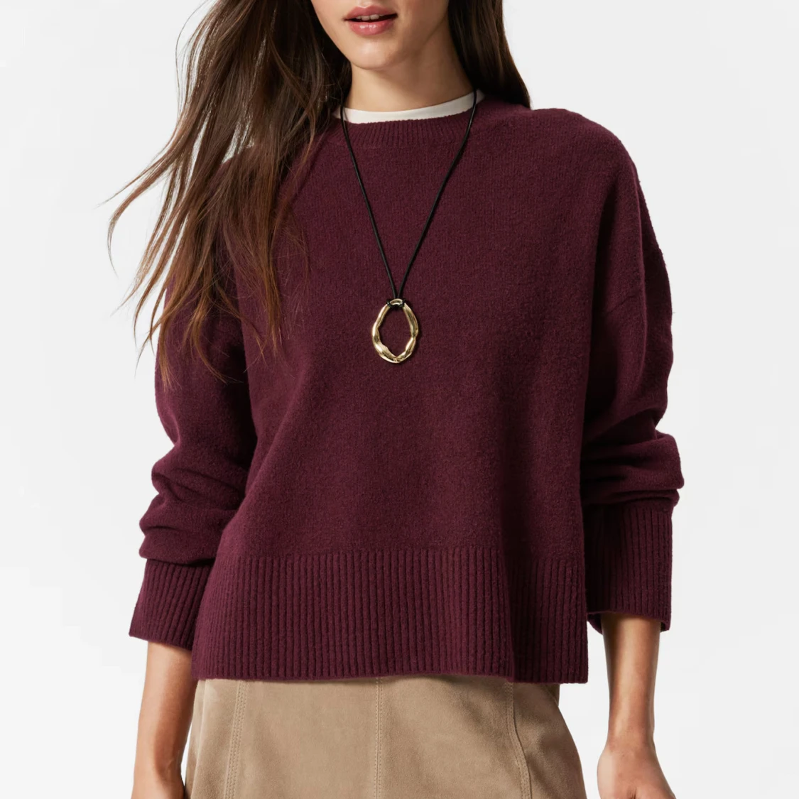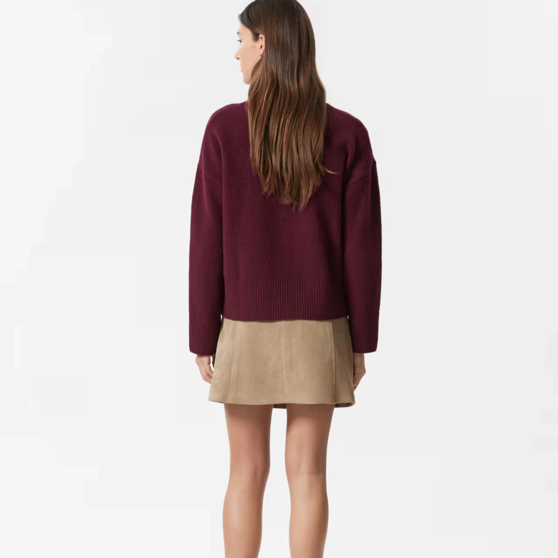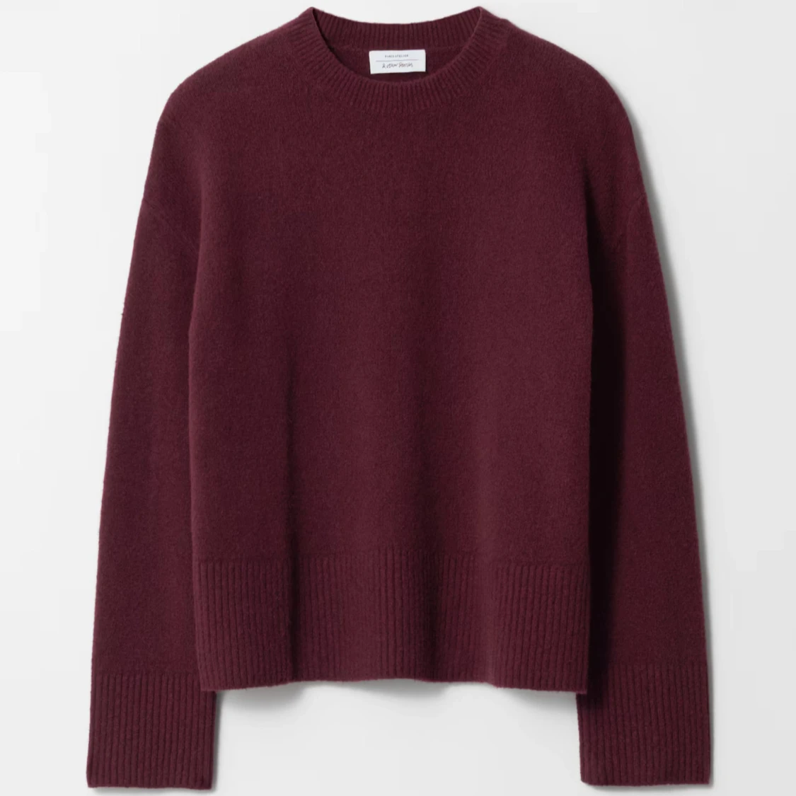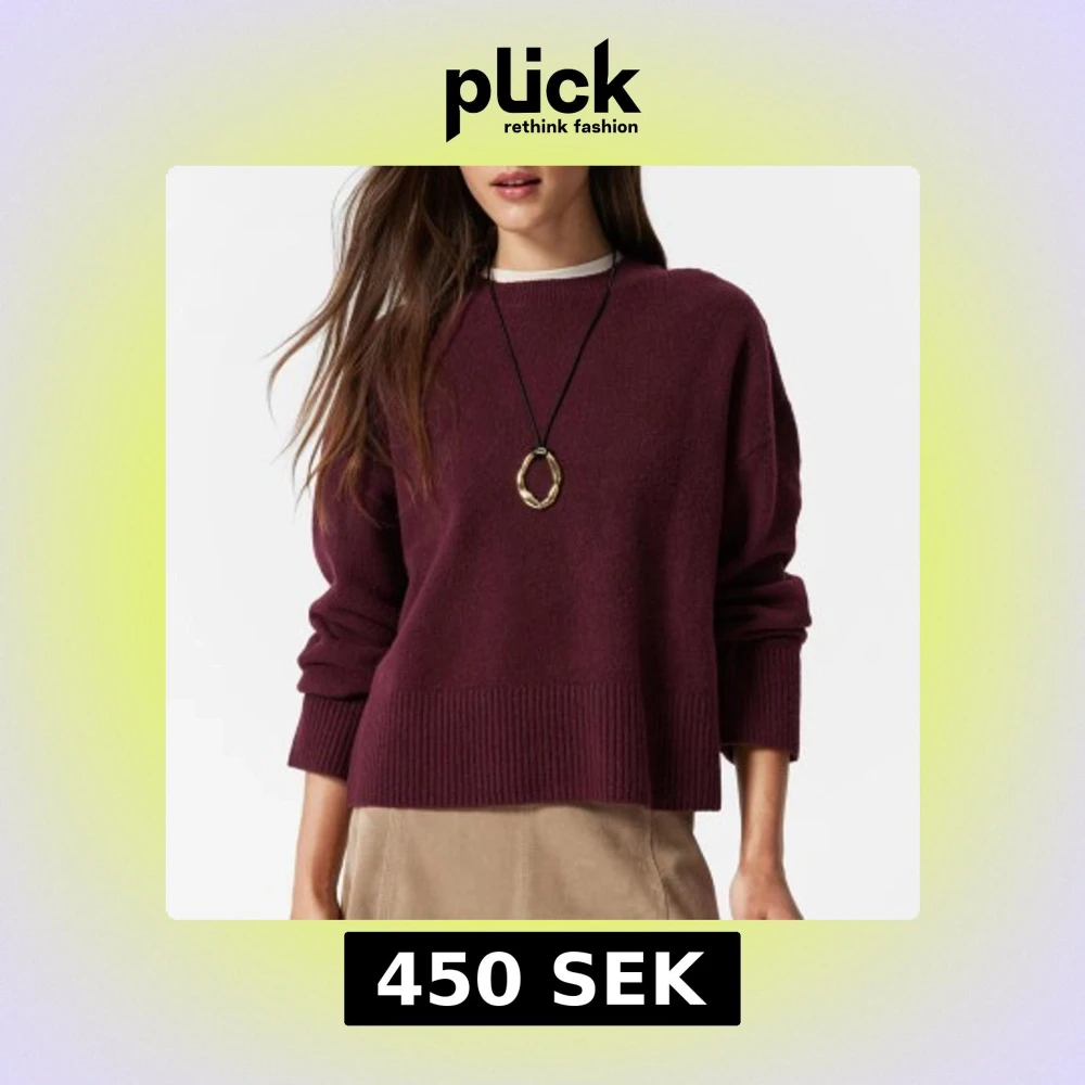 Mysig vinröd kashmirtröja från & Other Stories med rund halsringning och breda ribbade muddar. Tröjan har en loose passform och långa ärmar, perfekt för lager på lager under höst och vinter. Enkel och stilren design som är lätt att matcha.