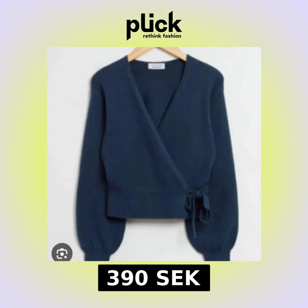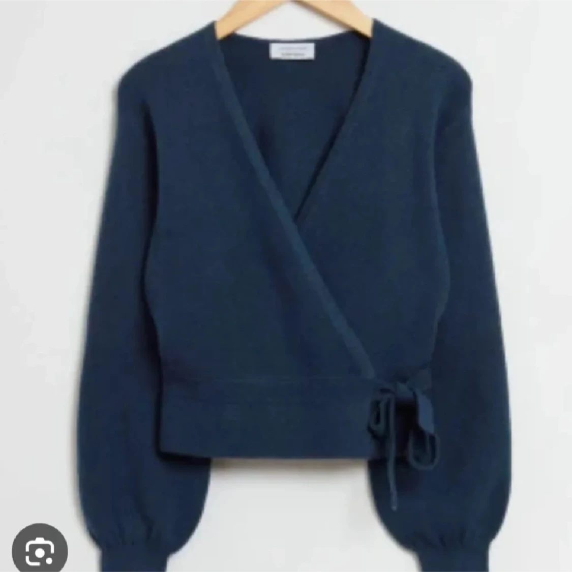 Supersnygg mörkblå omlottkofta med knyt i sidan och v-ringad hals. Koftan har långa ärmar med bred mudd och är stickad i ett mjukt material. Perfekt att slänga över en topp för en chill men stilren look.