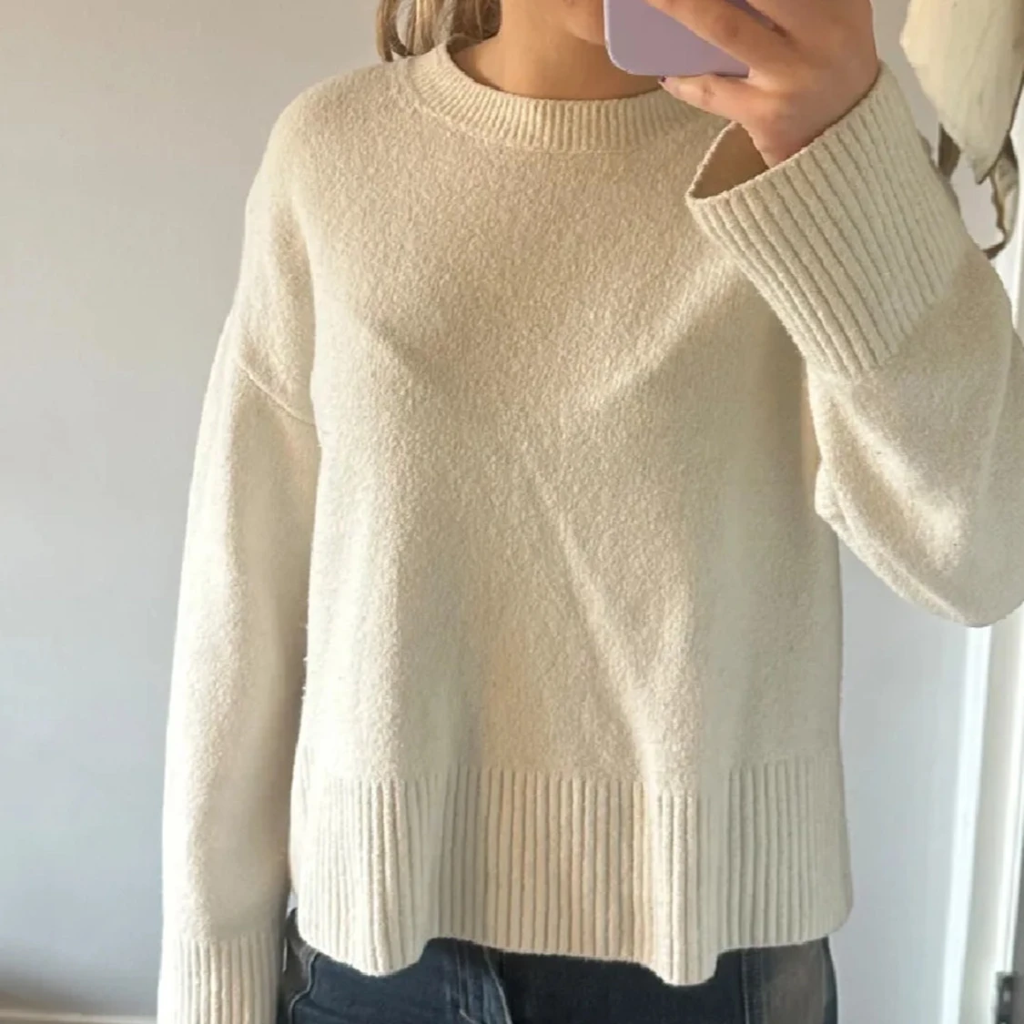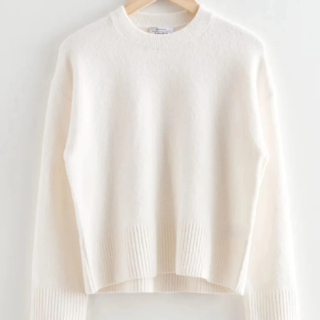 Superfin vit stickad tröja från & Other Stories. Den är perfekt för kyliga dagar med sin mjuka och varma känsla. Tröjan har långa ärmar och en klassisk rund halsringning. Ribbstickade detaljer vid ärmslut och nederkant ger en snygg !
