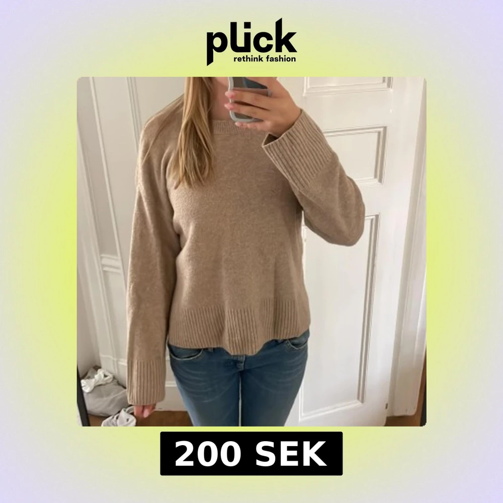 Säljer en beige stickad tröja med breda ribbade muddar vid ärmslut och nederkant. Tröjan har en loose passform och är långärmad, perfekt för att hålla sig varm under kyliga dagar. Enkel och stilren design som är lätt att matcha med jeans eller andra favoritplagg.