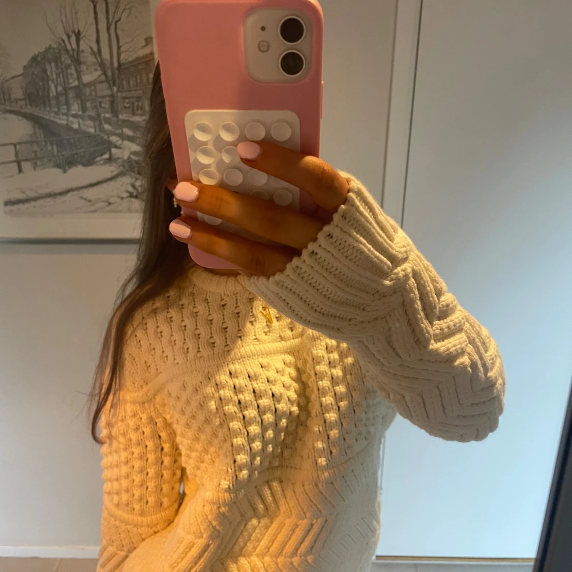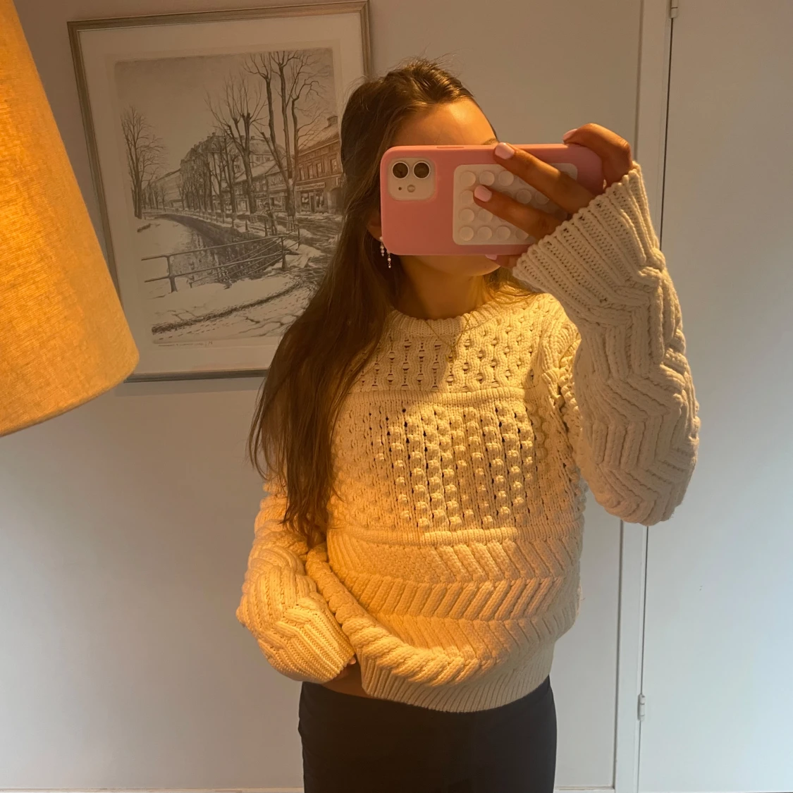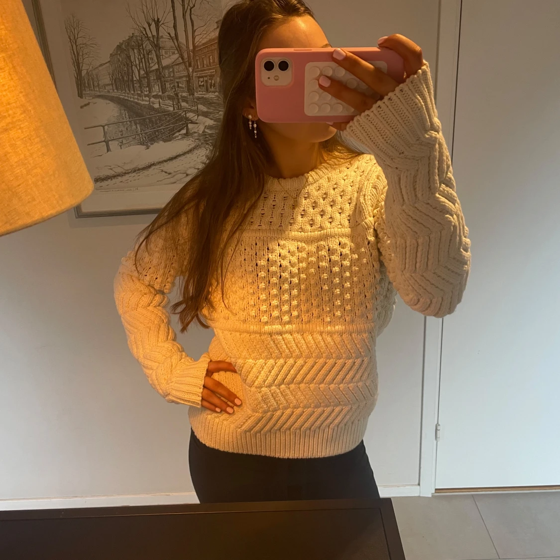 Säljer en mysig beige stickad tröja med ett fint mönster. Tröjan har långa ärmar och ribbstickade muddar vid ärmslut och nederkant. Perfekt för kyliga dagar man vill känna sig mysig!💗