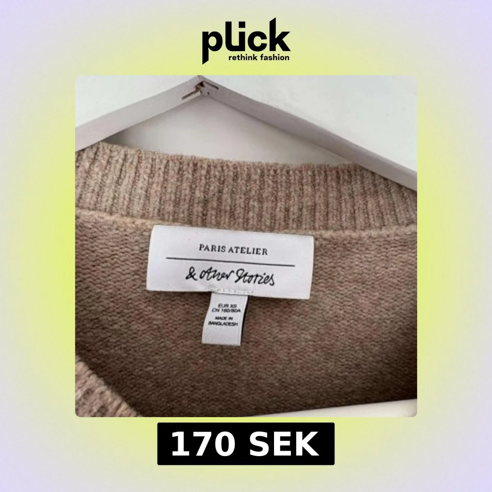 Snygg beige stickad tröja från & Other Stories Paris Atelier i storlek XS. Tröjan har en rund hals, långa ärmar och breda ribbade muddar vid ärmslut och nederkant. Perfekt för lager-på-lager och chill stil under höst och vinter.