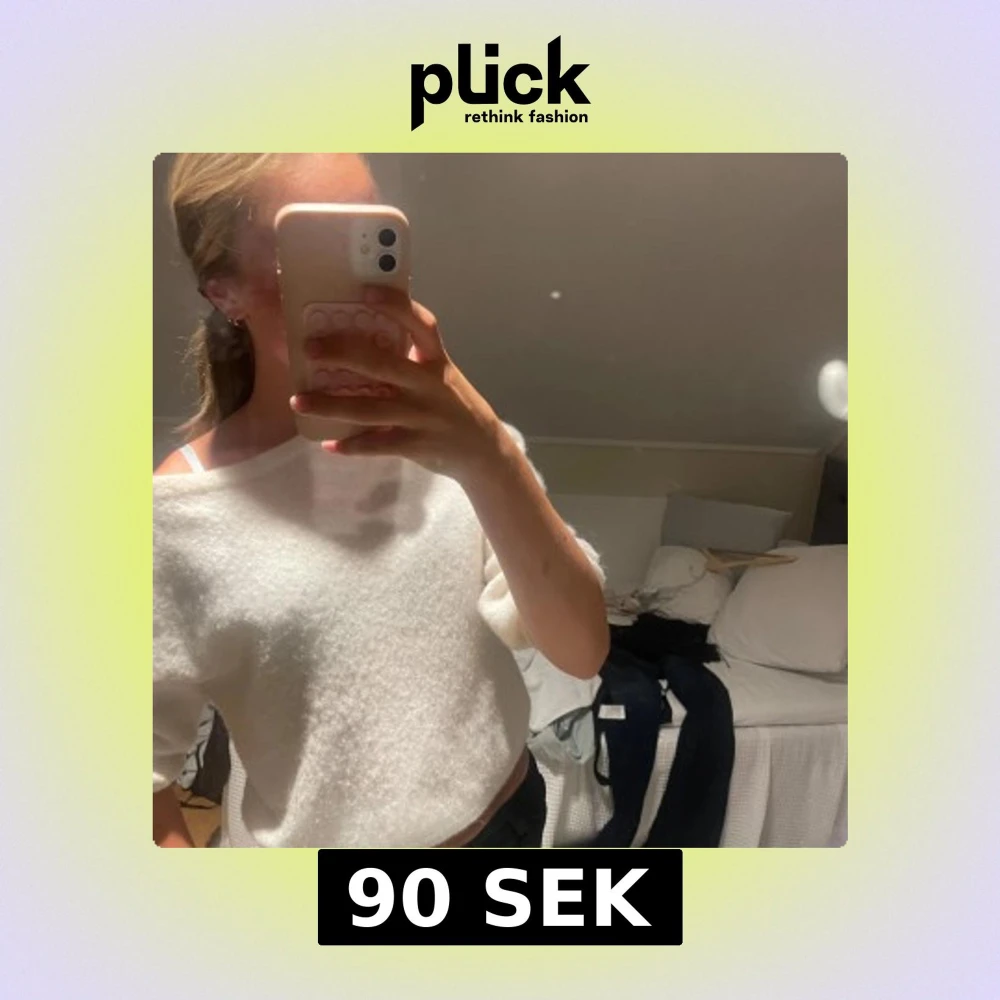 Supermjuk vit stickad tröja med croppad passform och lite bredare halsringning. Perfekt till svarta jeans eller kjol. Tröjan har Trekvarts armar