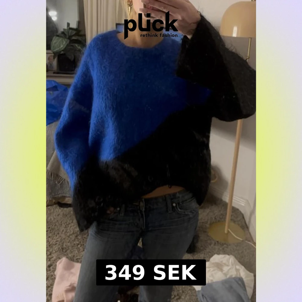 Säljer en oversized, fluffig stickad tröja från & Other Stories i blått och svart. Tröjan har långärmade, vida ärmar och en rund halsringning. Materialet är mjukt och ger en mysig känsla, perfekt för kyliga dagar. Snygg färgblockad design som sticker ut.