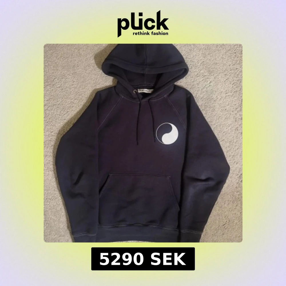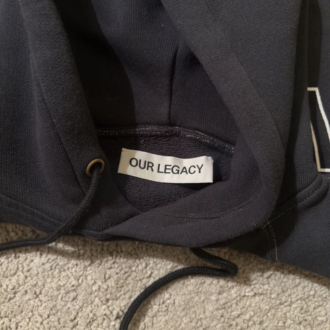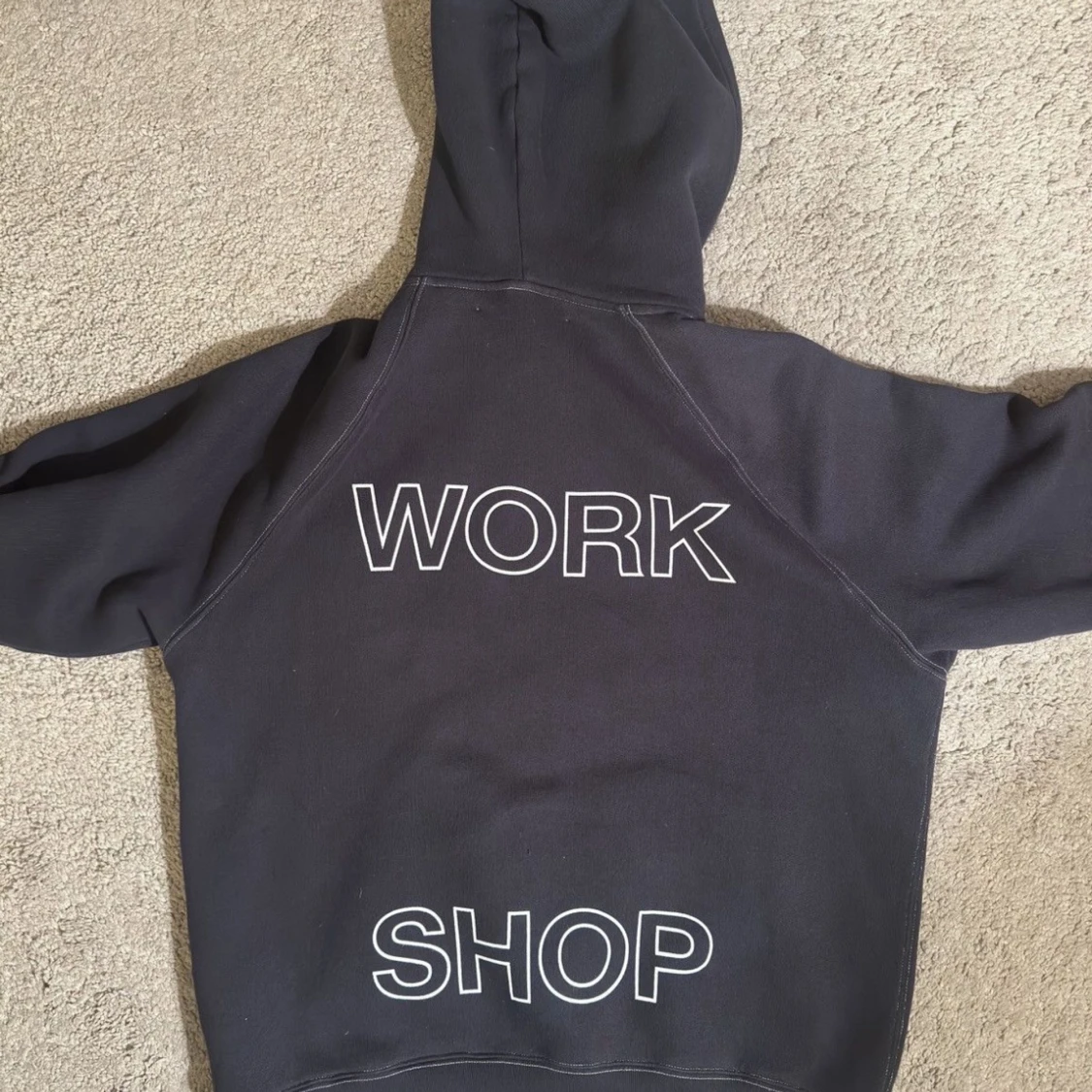 Svart hoodie från Our Legacy med vit grafisk detalj på bröstet och stor WORK SHOP-tryck på ryggen. Klassisk känguruficka, snörning i huvan och mjukt material. Perfekt för dig som gillar streetwear och stilrena plagg. storlek 48 motsvarar då medium ish