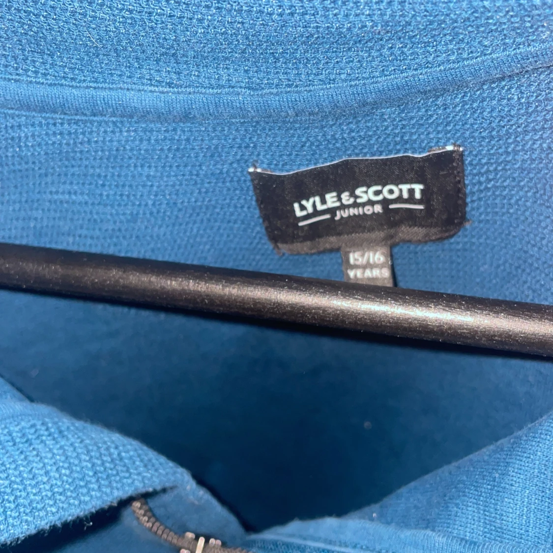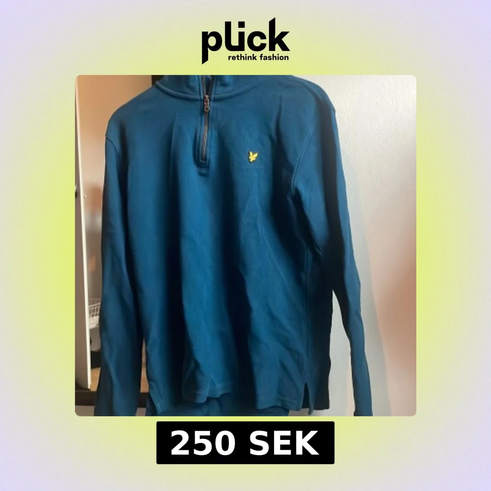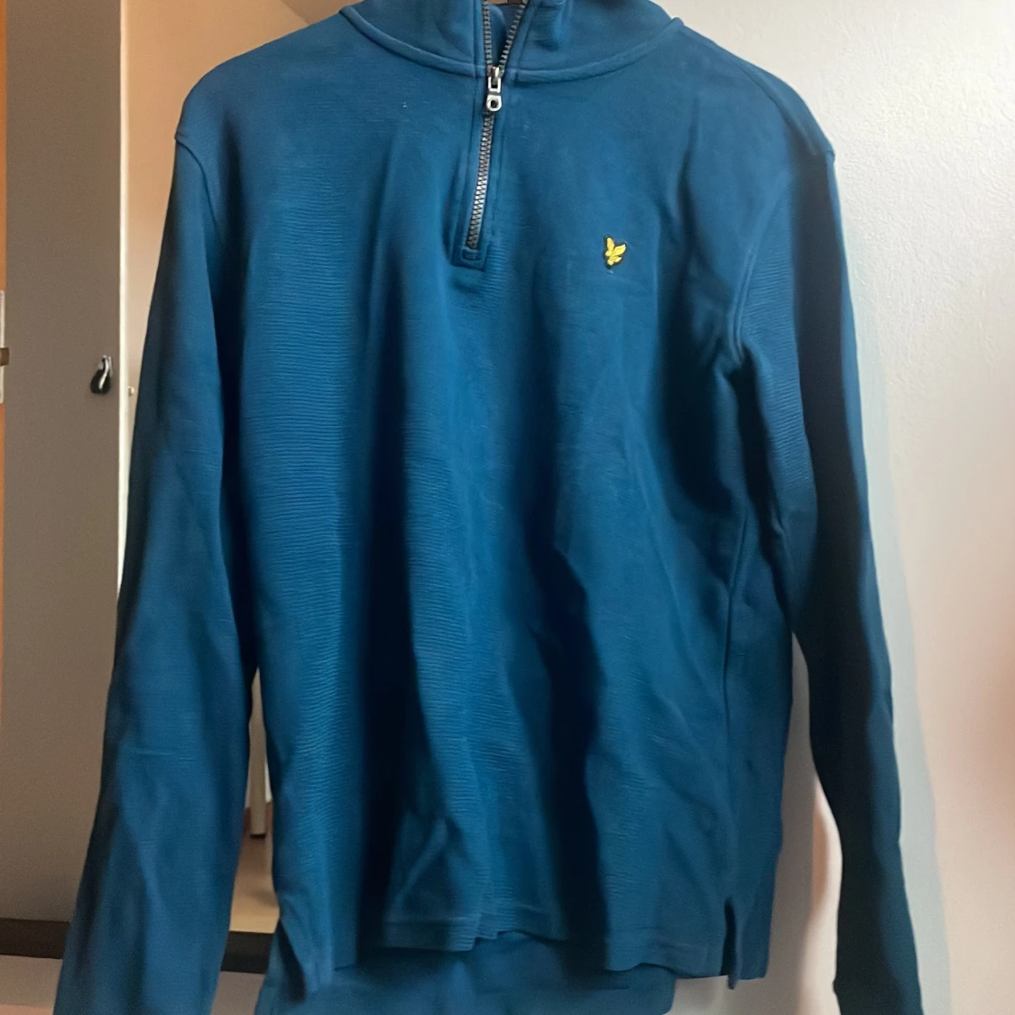 Snygg blå långärmad tröja från Lyle & Scott med half zip och klassisk gul logga på bröstet. Tröjan har hög krage och är tillverkad i mjuk bomull, perfekt för en chill och stilren look. Kontakta mig om ni har några funderingar