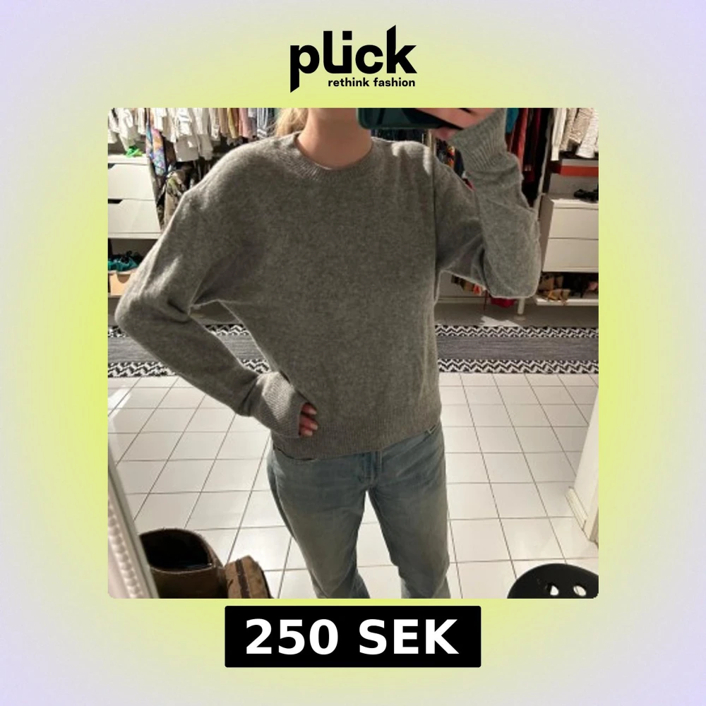 Säljer en mysig grå stickad tröja med rund hals och långa ärmar. Perfekt för kyligare dagar. Tröjan har ribbade muddar vid ärmslut och nederkant för extra komfort.