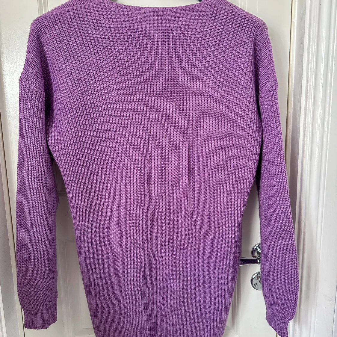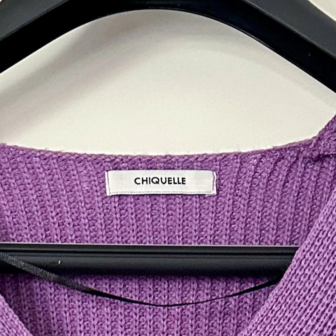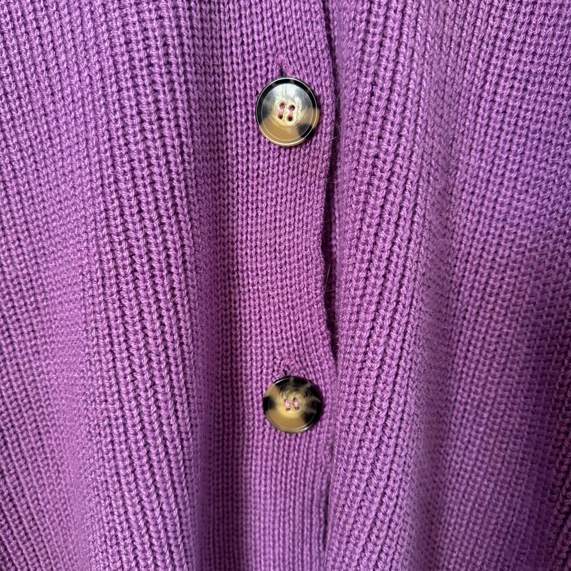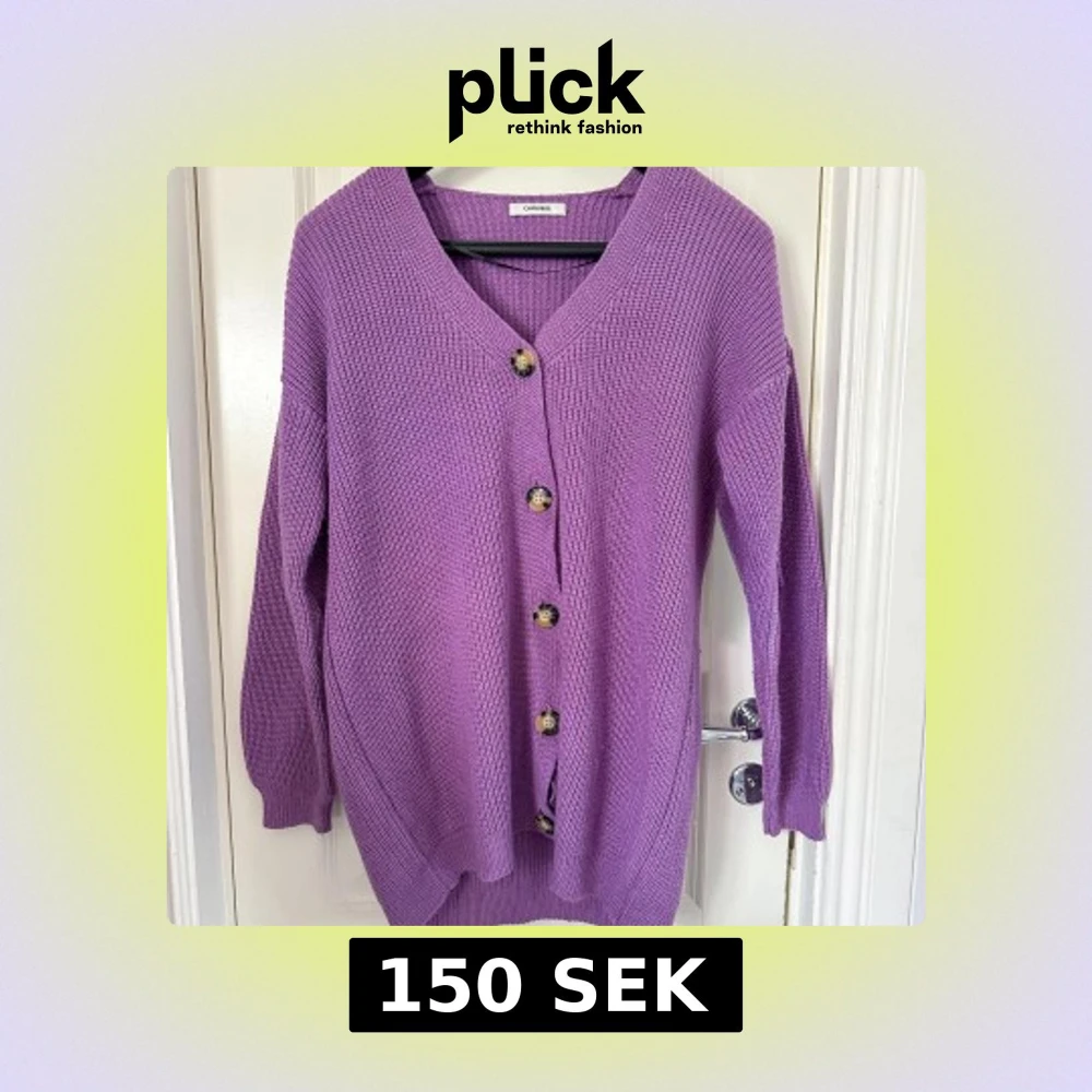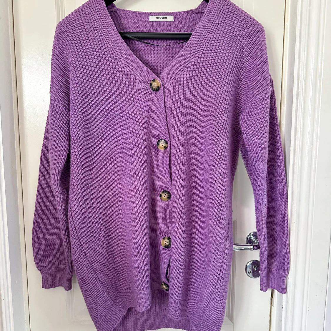 Superfin lila kofta från Chiquelle med chunky stickning och stora, snygga knappar framtill. Koftan har en avslappnad passform och långa ärmar, perfekt att slänga på sig när det är lite kyligare ute.
