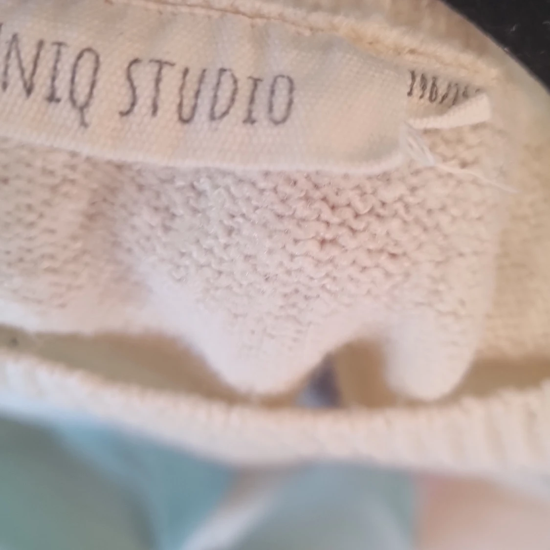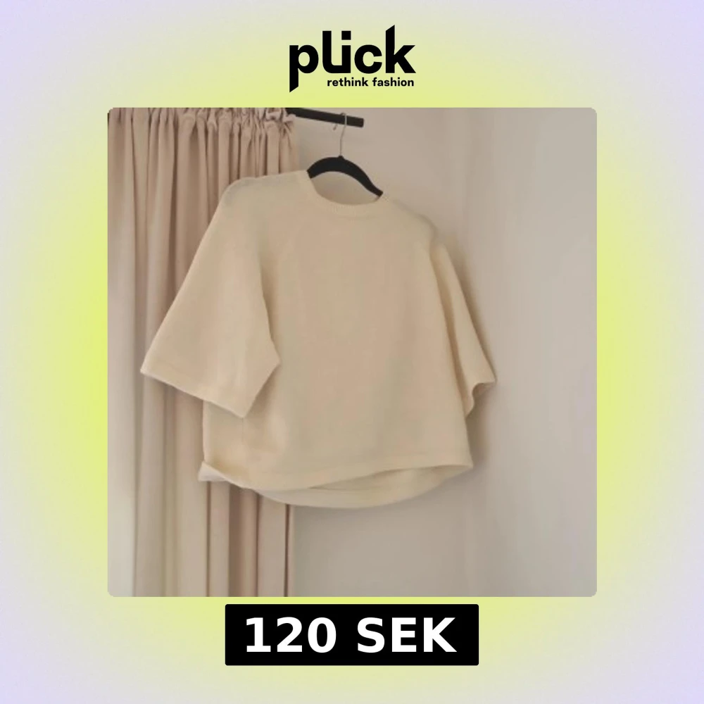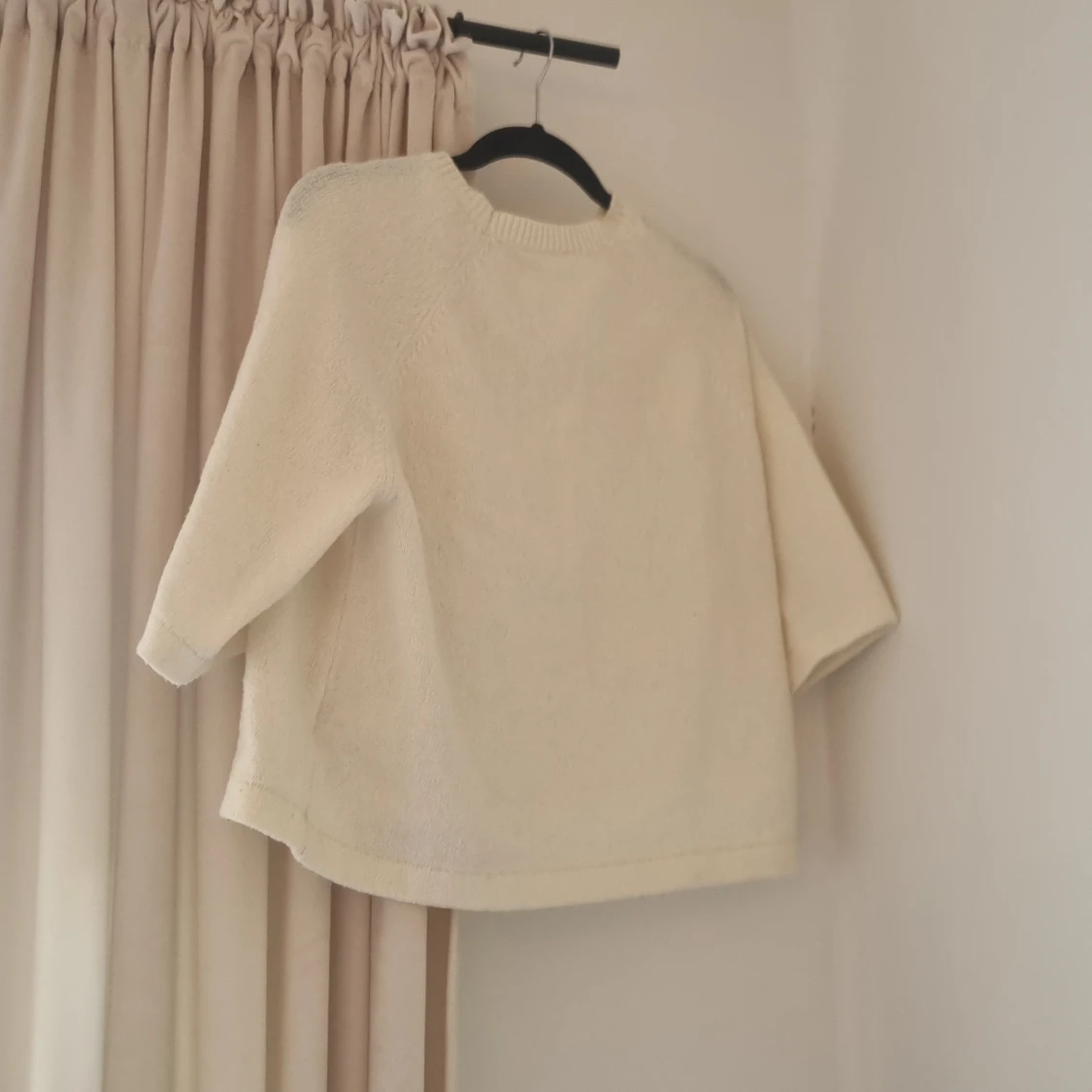 Superfin oversized stickad tröja från UNIQ STUDIO i en ljus beige färg. Tröjan har rund halsringning och vida trekvartsärmar för en chill och trendig look. Perfekt att styla med jeans eller kjol för en avslappnad vibe.