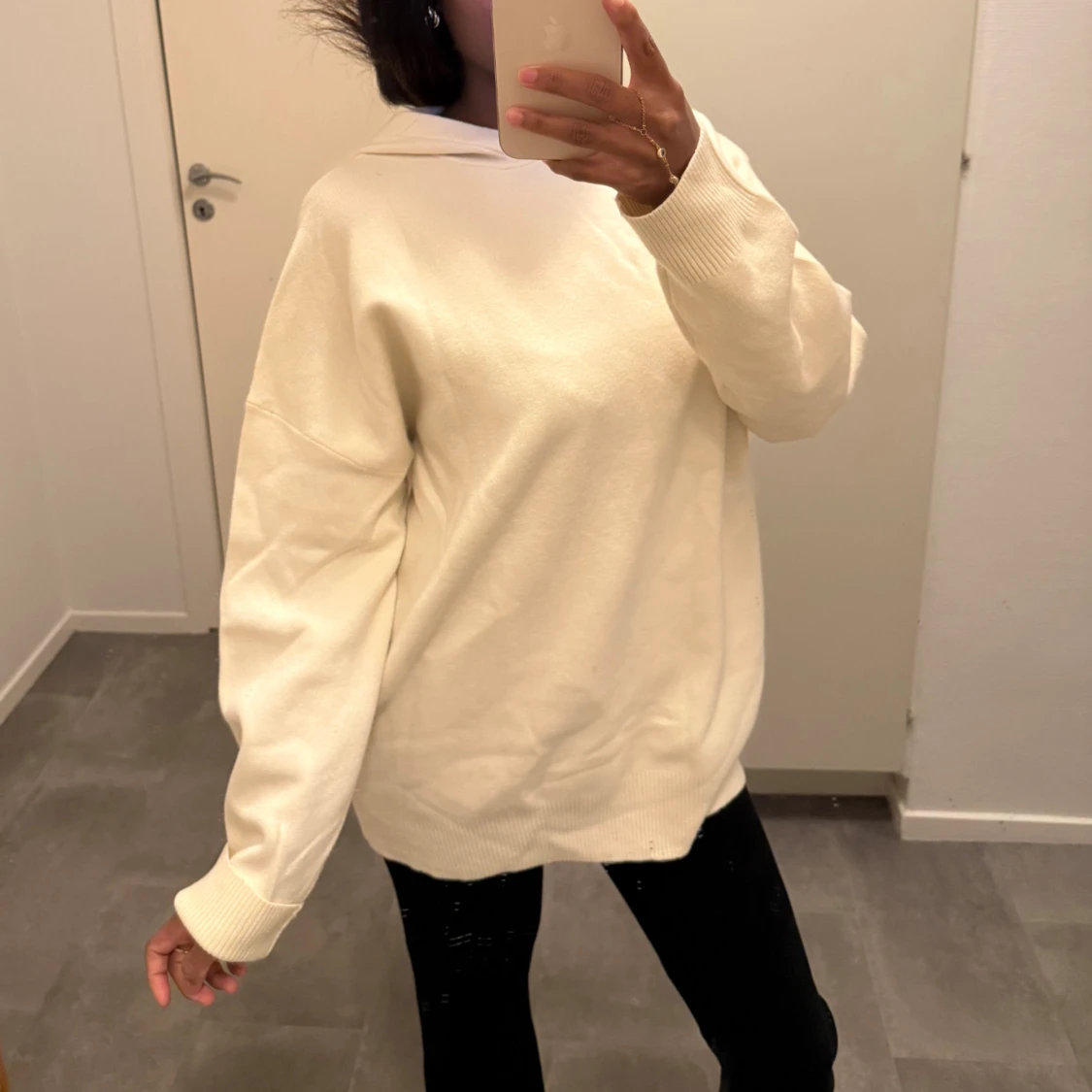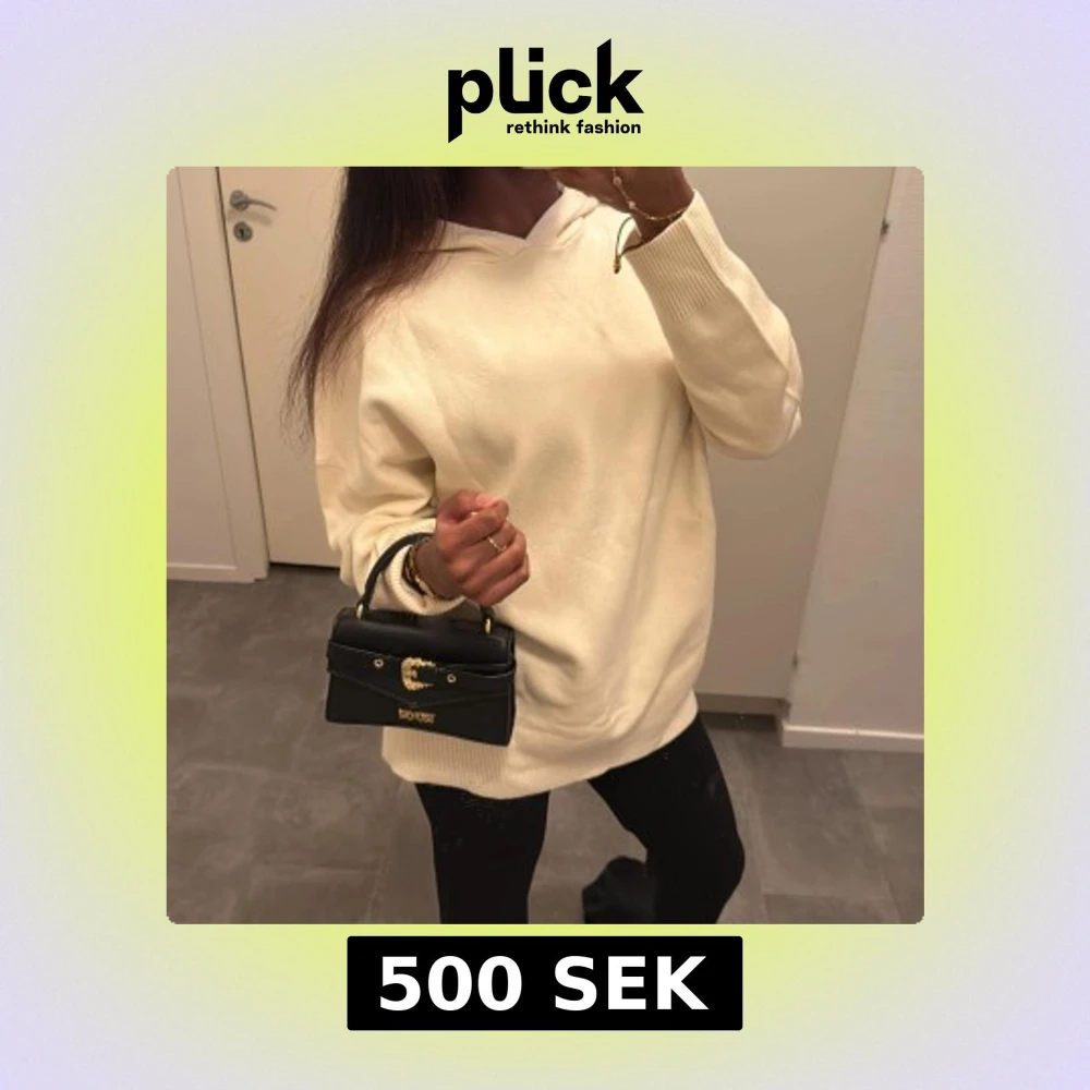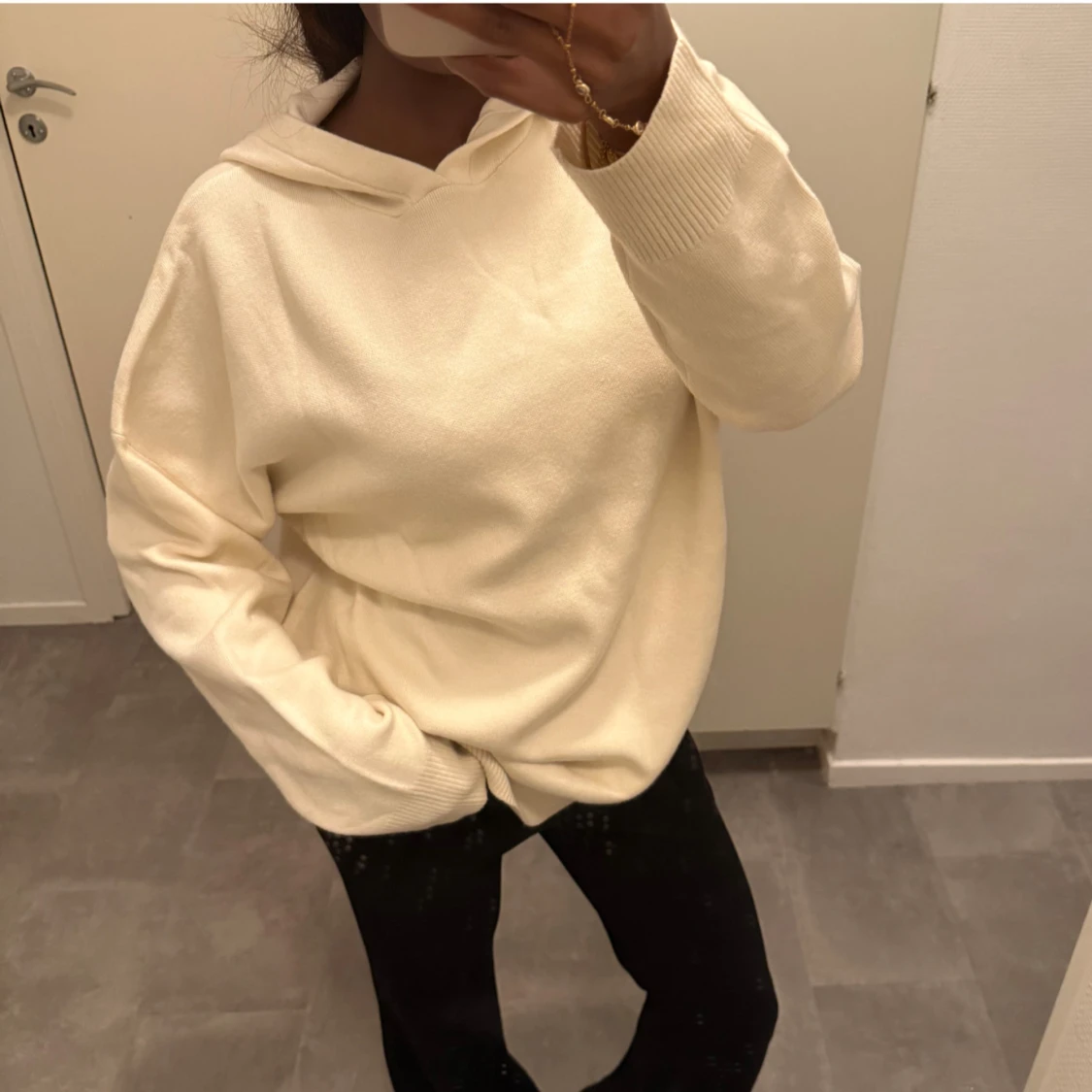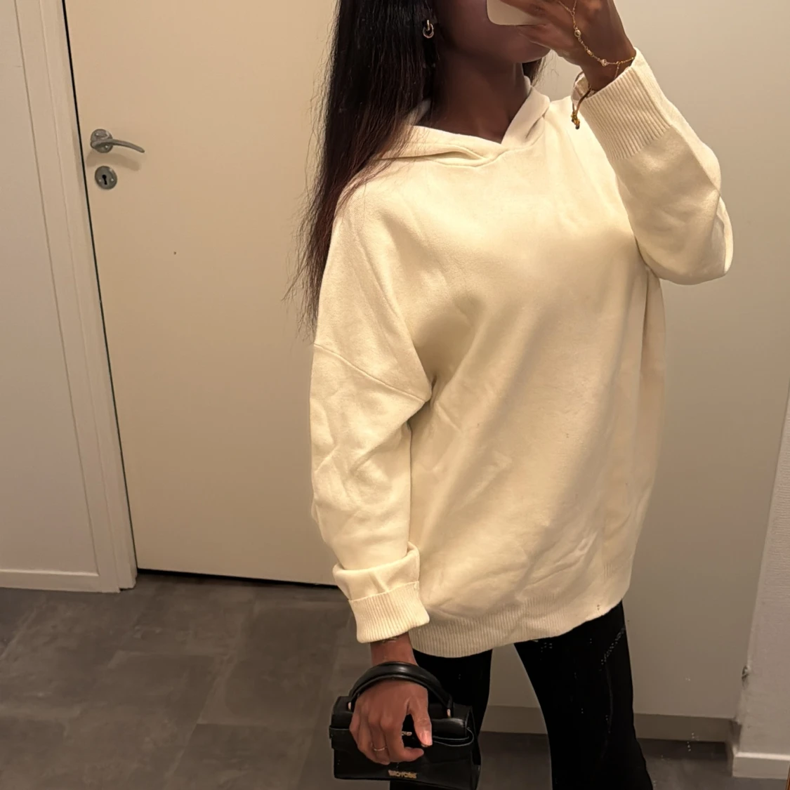Oversized vit hoodie med huva och långa ärmar. Tröjan har breda ribbade muddar vid ärmslut och nederkant, samt en mjuk och slät yta 🎀