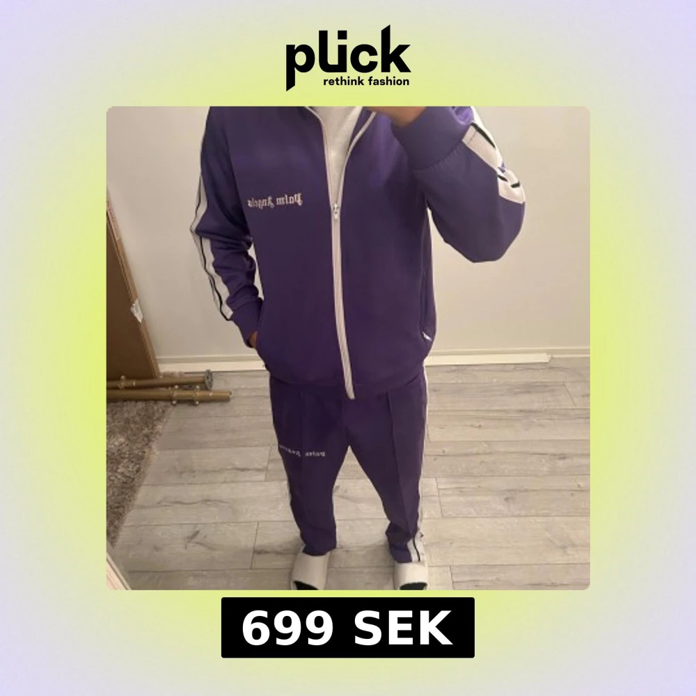 Snyggt lila träningsset från Palm Angels med vita detaljer. Jackan har dragkedja och byxorna har elastisk midja. Perfekt för en avslappnad stil.